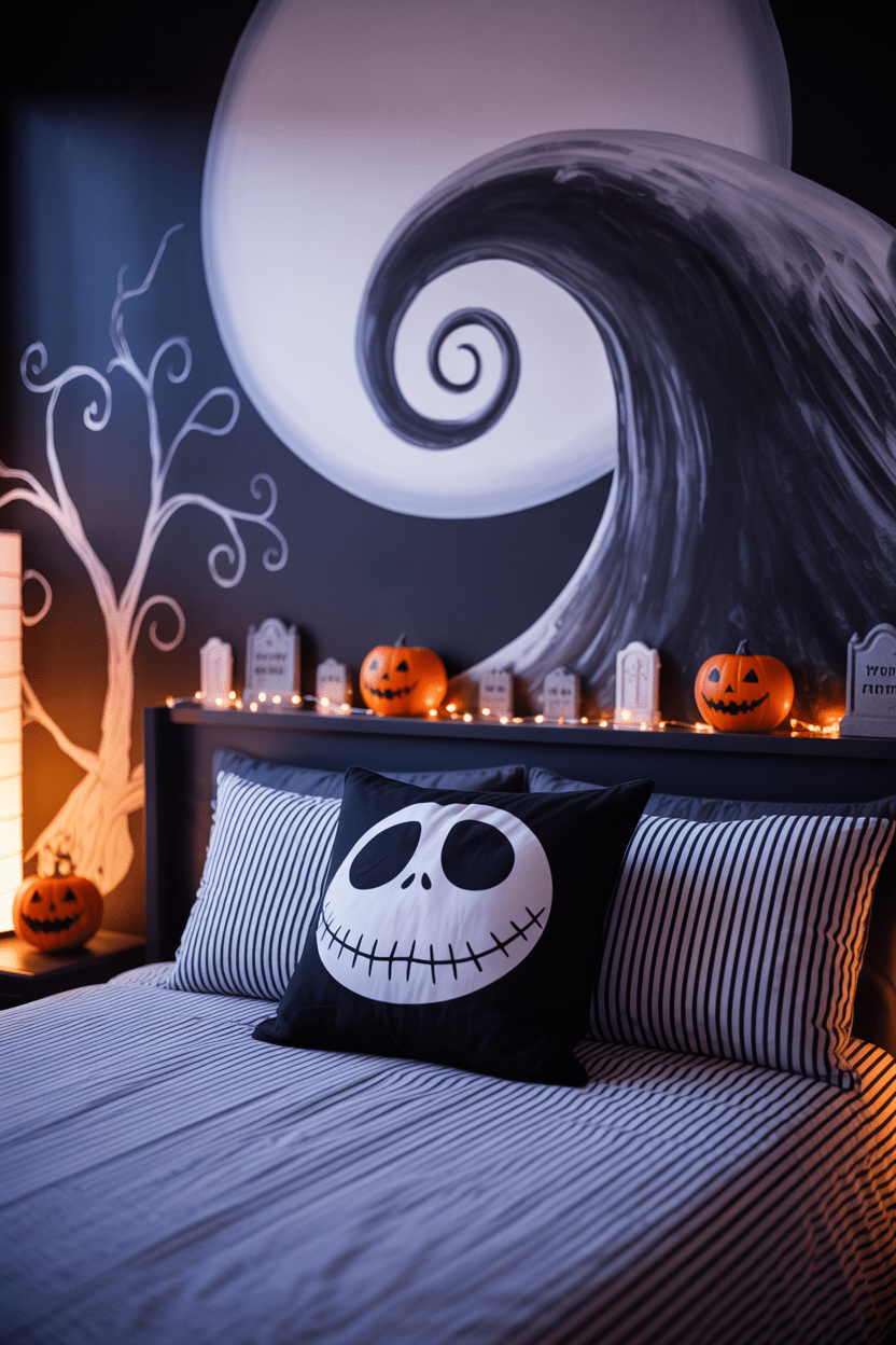 This one’s for the fans of quirky, unexpected holiday style. A Nightmare Before Christmas bedroom theme blends spooky and festive vibes for a Christmas bedroom aesthetic that’s totally unique. I love it because it’s playful and instantly Pinterest-worthy.