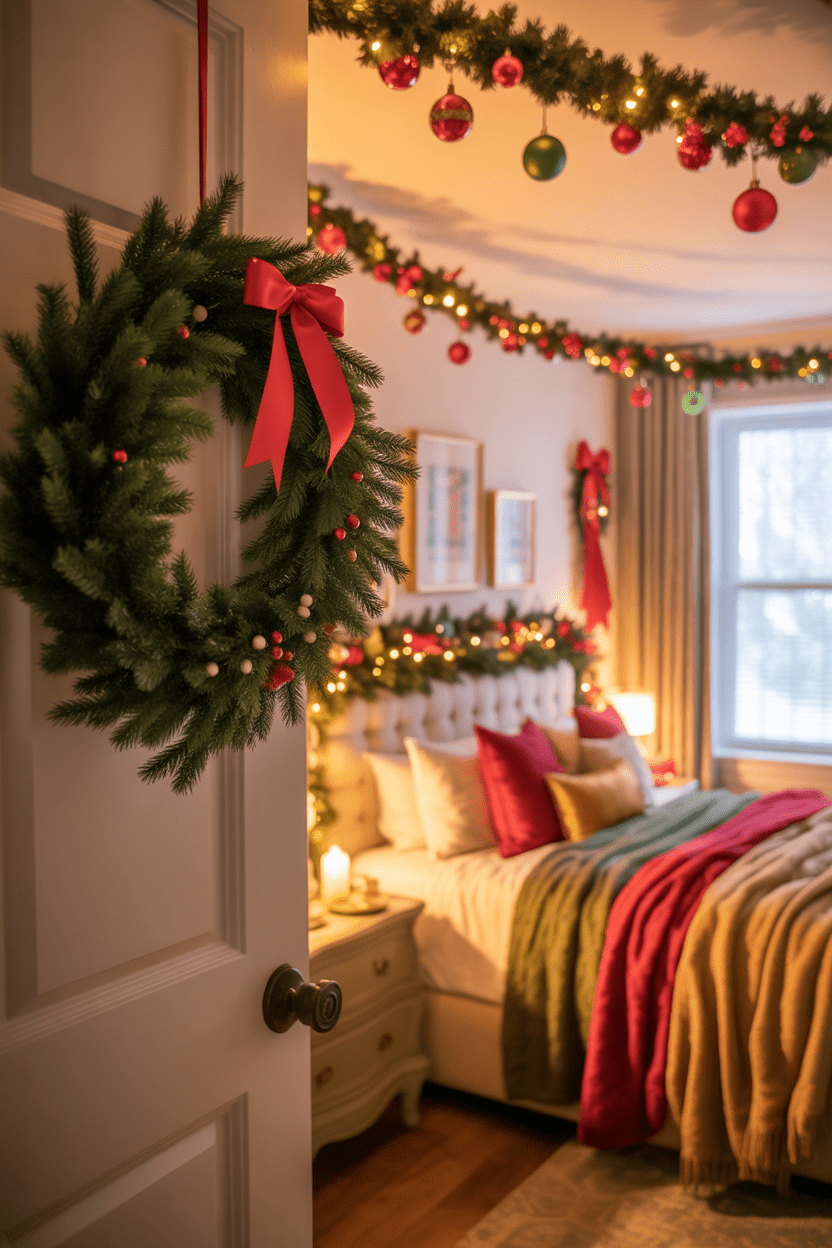 Don’t forget your doors and walls! Wreaths, garlands, and festive signs make a big impact without taking up floor space. These touches instantly make your bedroom feel fully decorated and totally holiday-ready.