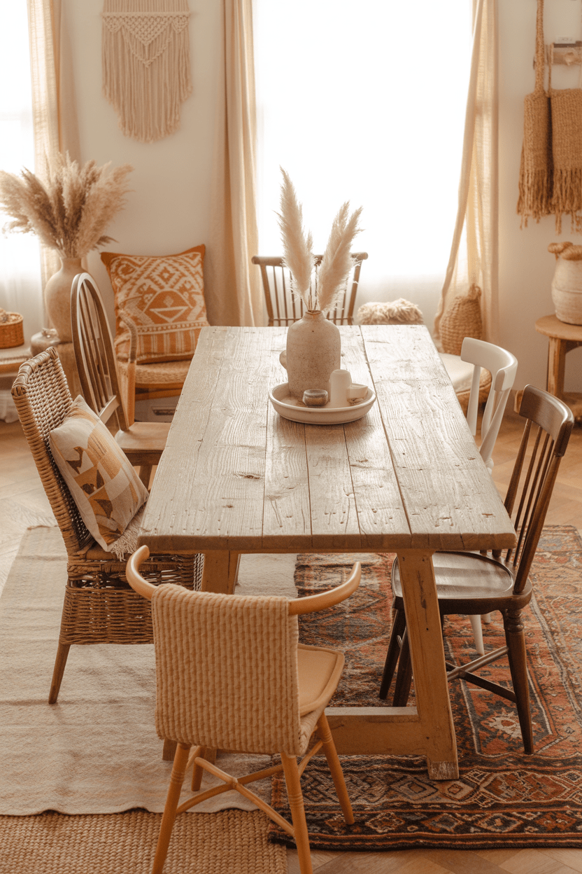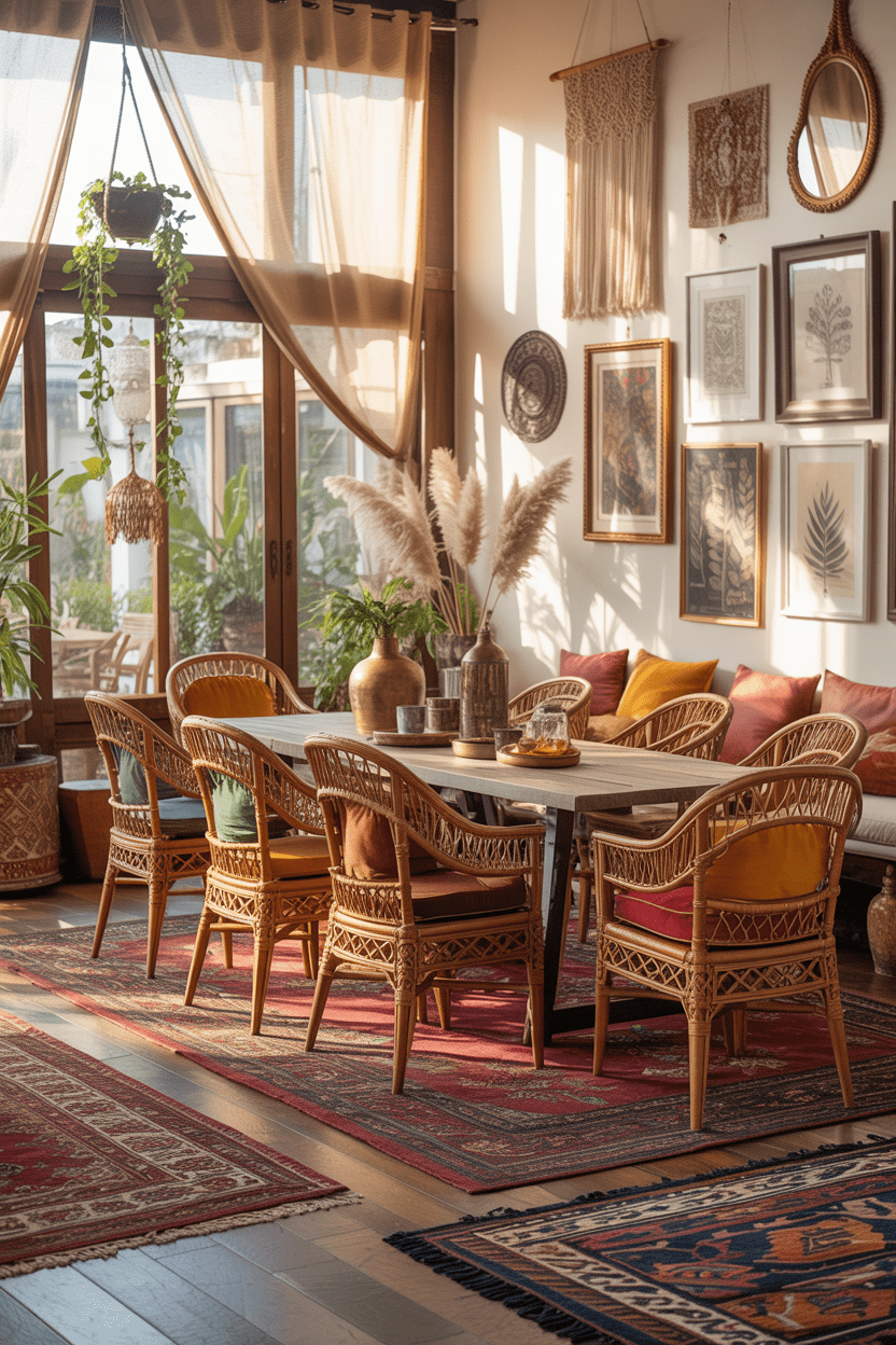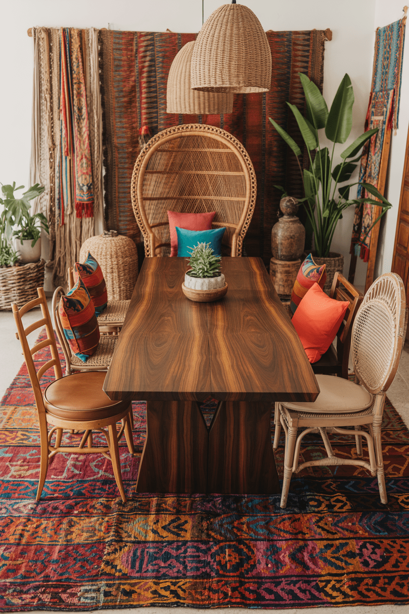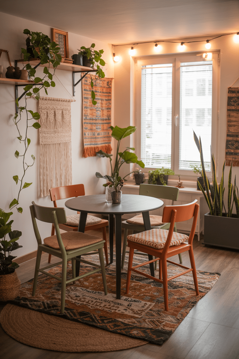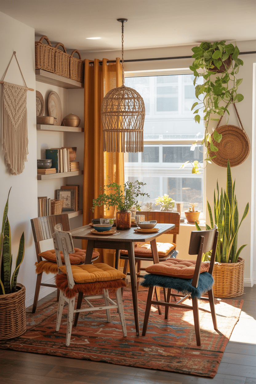 Even in smaller apartments, boho style can shine. Use compact furniture, layered rugs, and textured accents to create a dining space that’s cozy, functional, and full of personality.