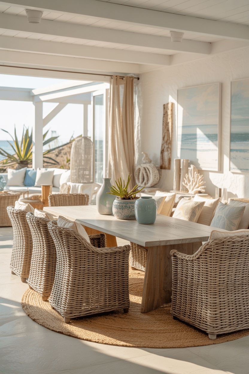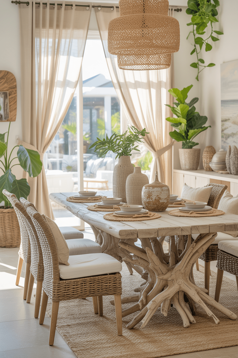 A boho beach-inspired dining room brings together relaxed coastal charm with boho texture. This look is all about mixing sandy neutrals, woven chairs, driftwood-style tables, airy linen curtains, and subtle ocean-inspired accents.