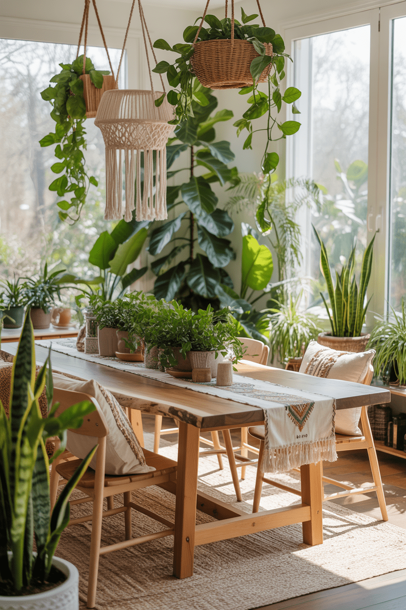 Indoor plants bring life and texture into your boho dining room. Hanging greenery, potted palms, and small table plants add freshness while complementing woven textures, wooden furniture, and earthy tones.