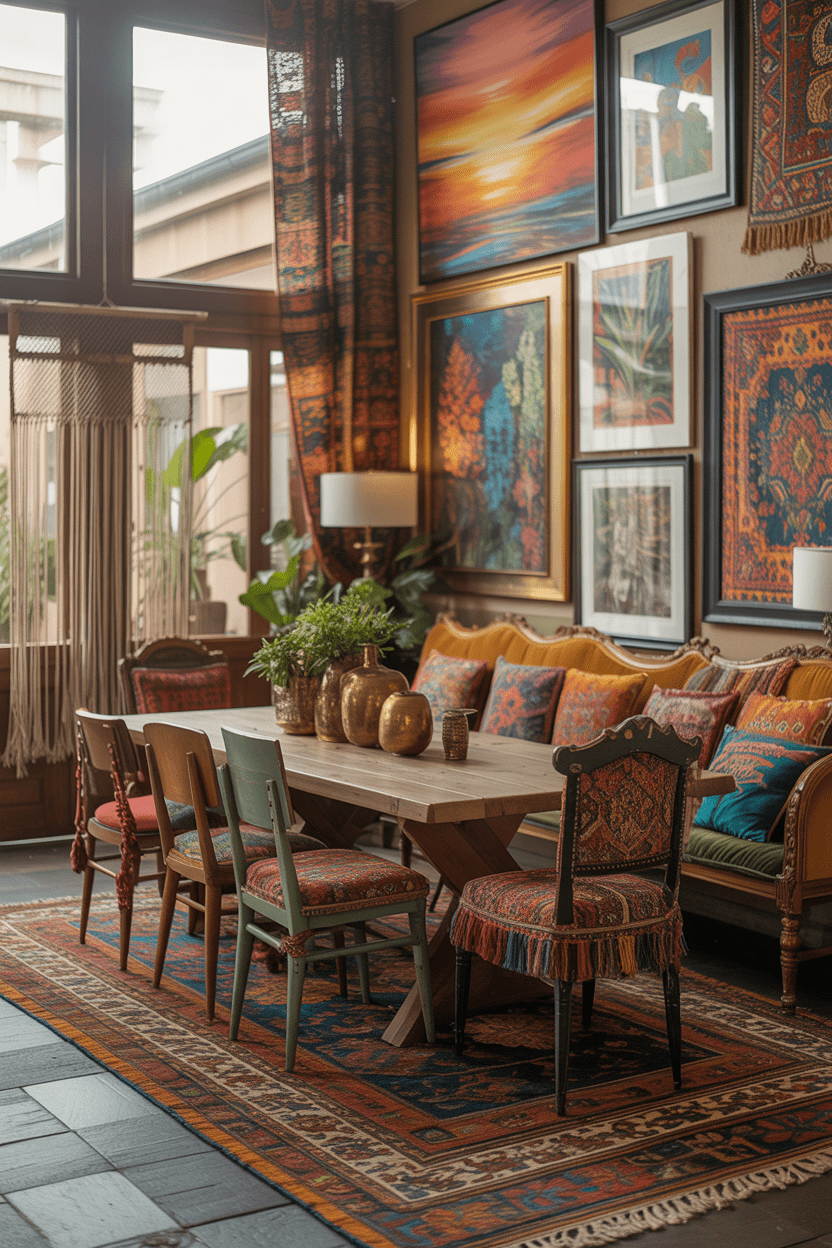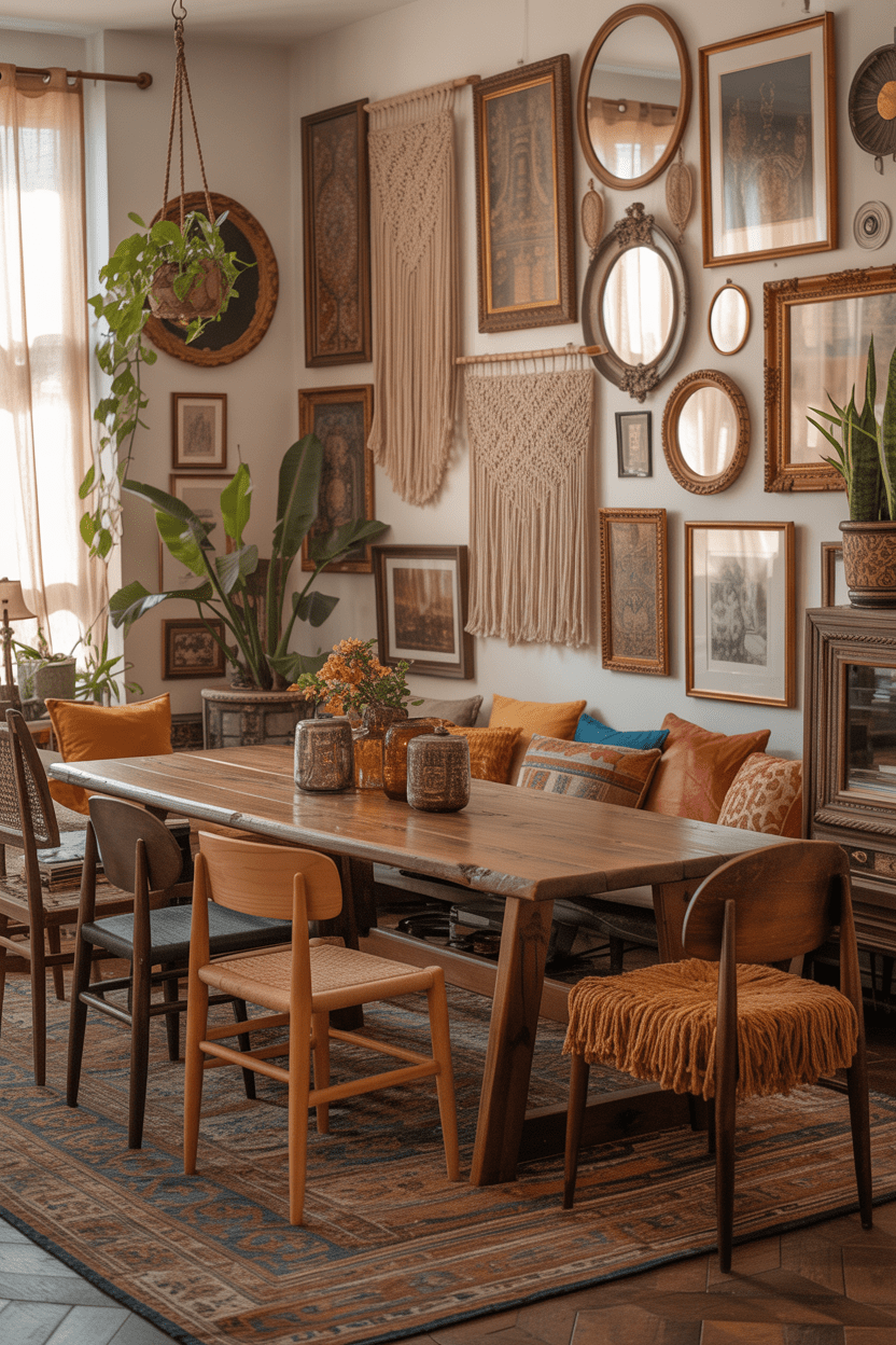 A gallery wall in a boho dining room is a creative way to add personality and visual interest. Combine framed art, macramé pieces, and mirrors to create a layered, eclectic display that feels curated and lived-in.