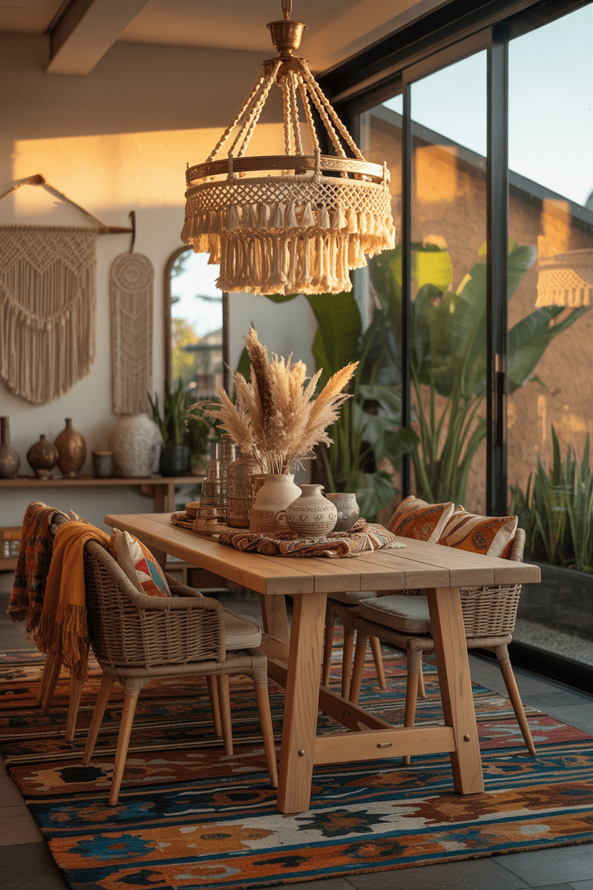 A statement chandelier instantly draws the eye and enhances the boho aesthetic. Look for designs in rattan, wicker, or metal with artistic shapes to add a unique focal point to your dining area.