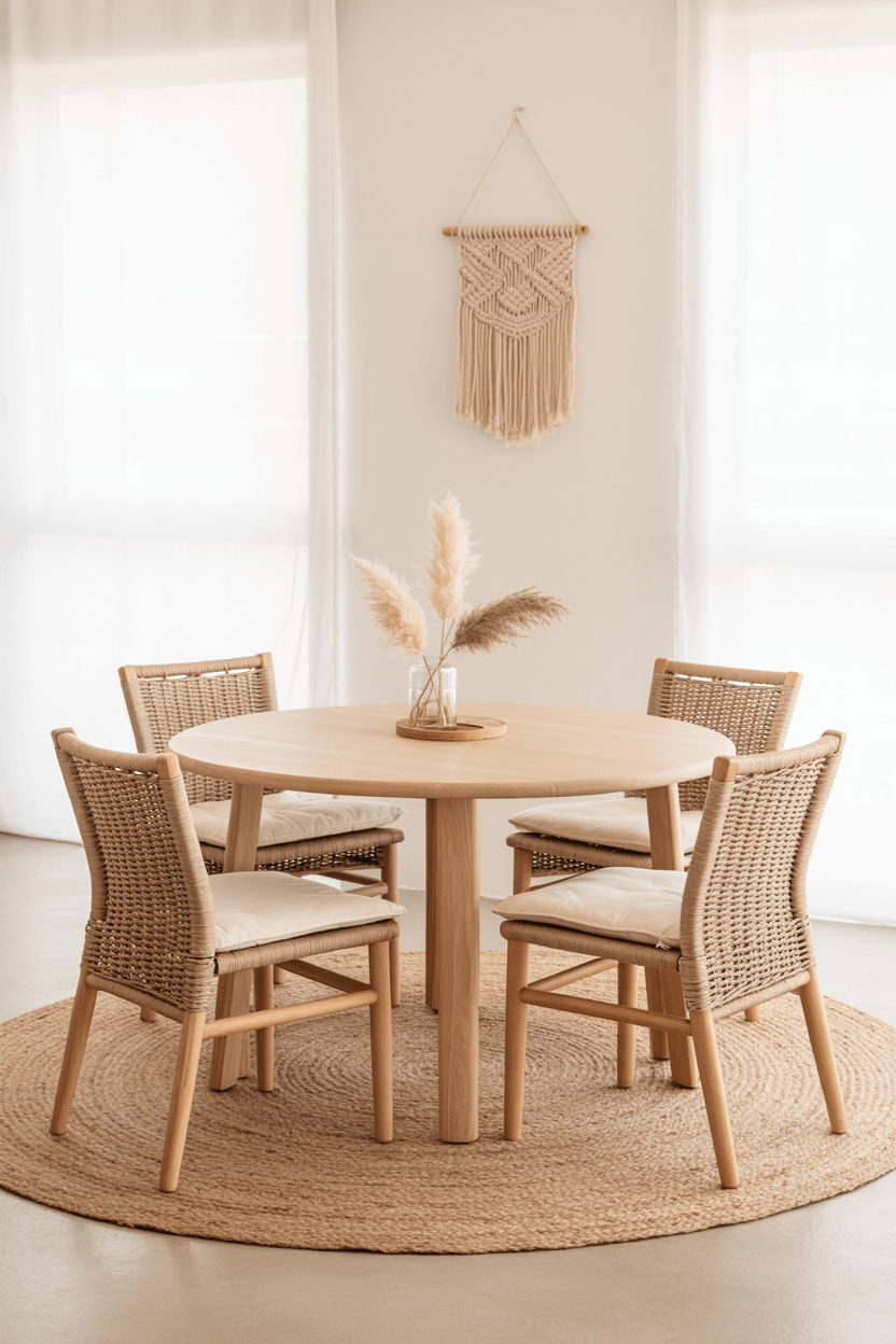 Round tables encourage conversation and a more intimate dining experience. Pair them with eclectic chairs and layered rugs for a visually interesting, boho-inspired dining space that feels both cozy and stylish.
