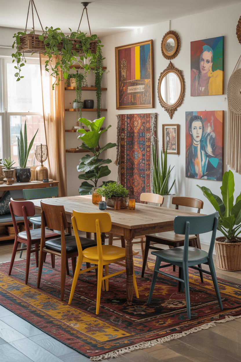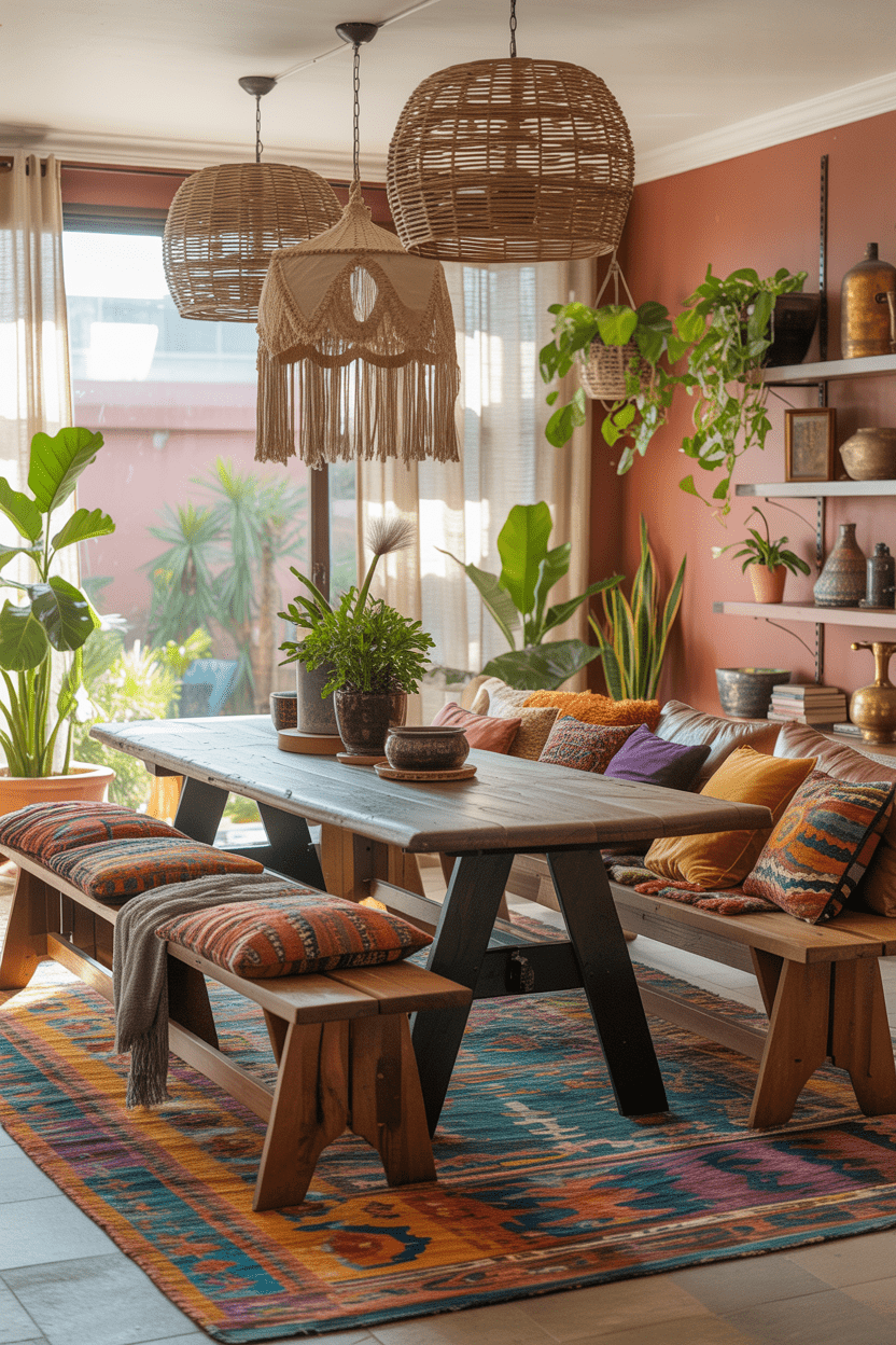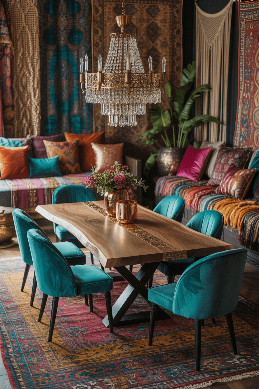 Bold colors and layered patterns make a boho dining room feel vibrant and energetic. Mix textiles, art, and furniture in complementary colors to create a space that feels both playful and thoughtfully designed.