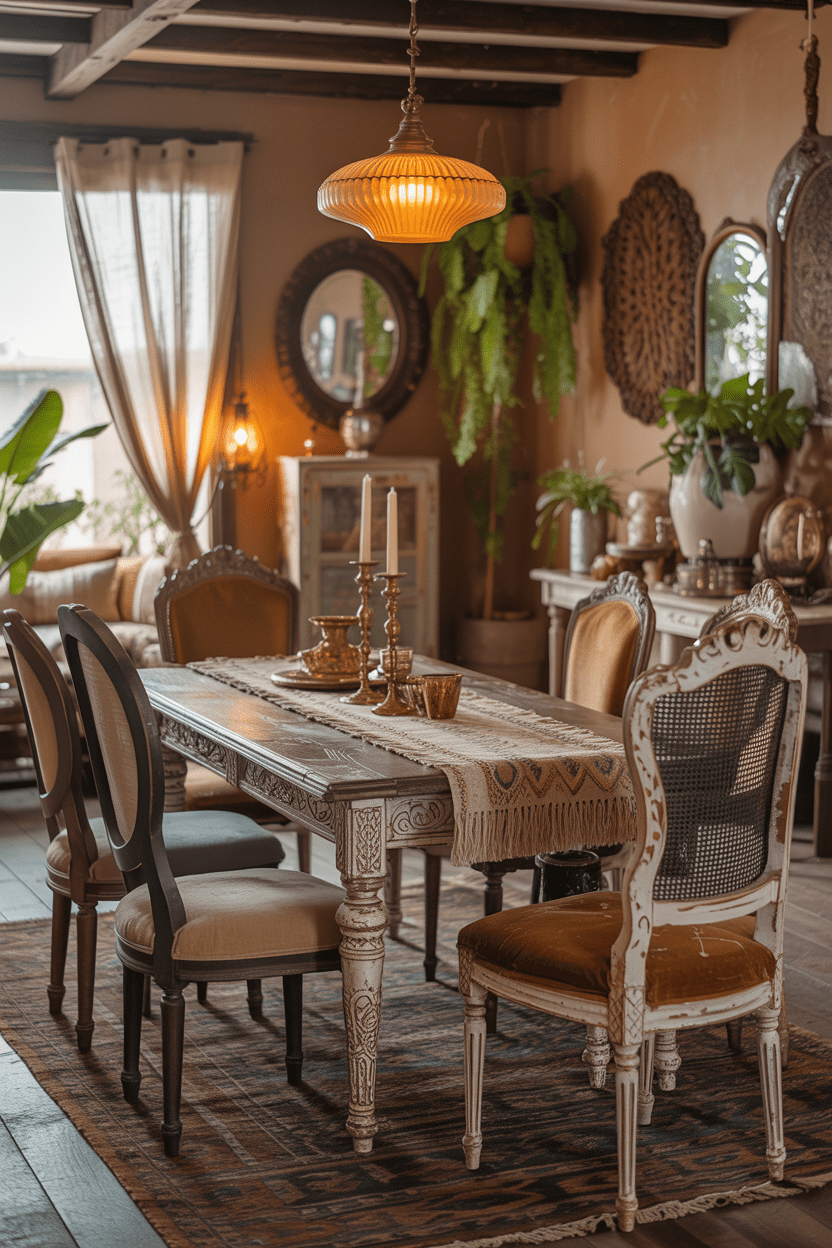 Vintage furniture and decor bring a sense of history and personality to a boho dining room. Pair antique chairs, retro lighting, and weathered wood tables with woven accents for timeless boho appeal.