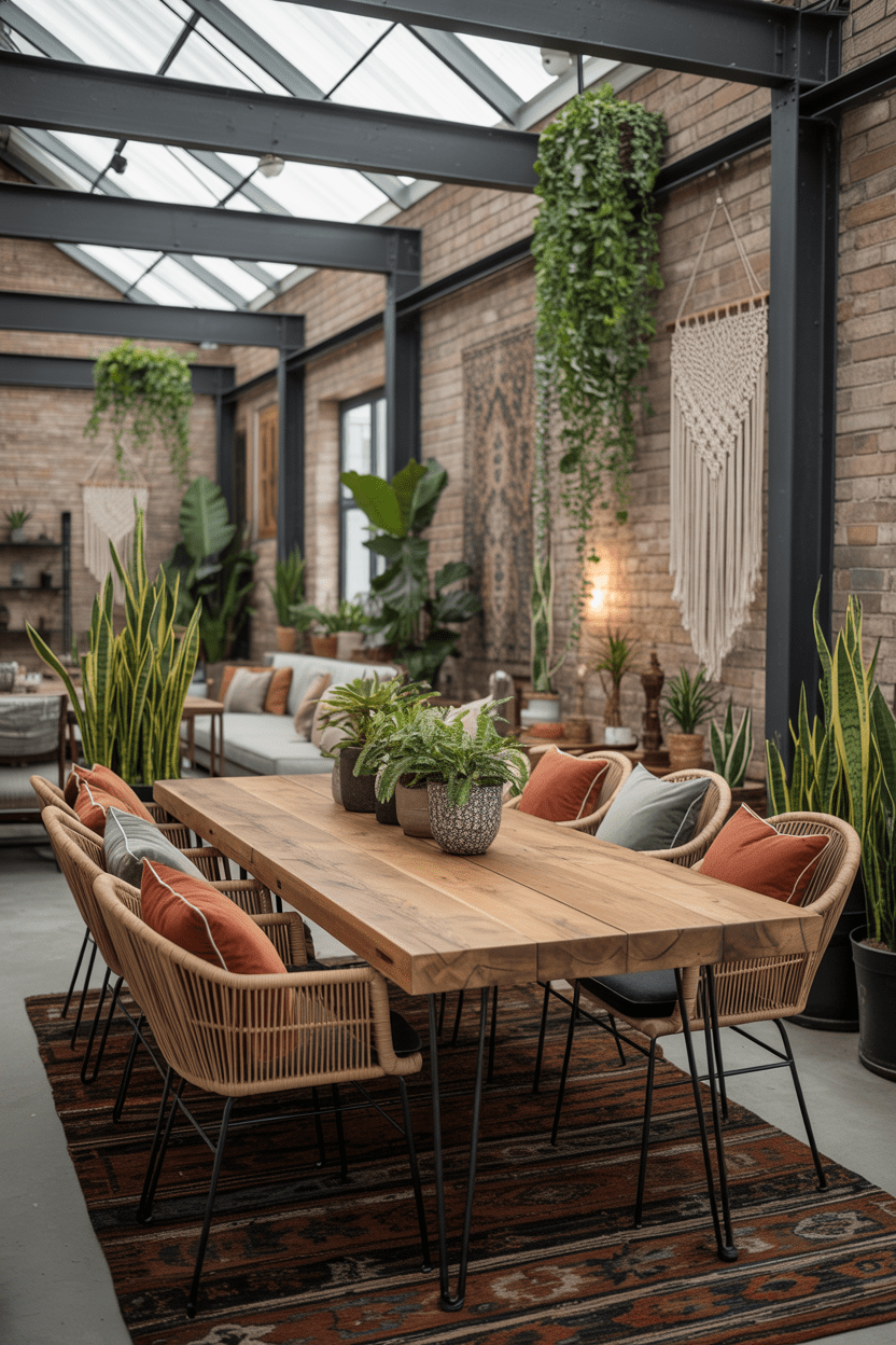 Industrial boho spaces combine raw wood, metal accents, and soft textiles. This fusion creates a stylish, edgy look that balances warmth and modernity while maintaining a relaxed boho vibe.