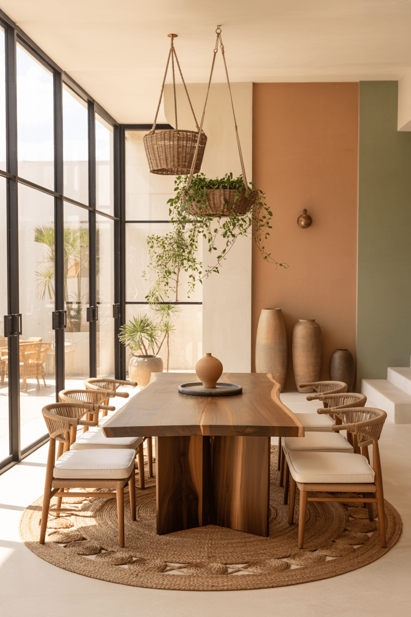 Modern boho dining rooms fuse sleek lines with natural textures and earthy tones. Think clean furniture paired with rattan chairs, jute rugs, and greenery. This style keeps your space feeling airy and sophisticated while still embracing that relaxed boho vibe.