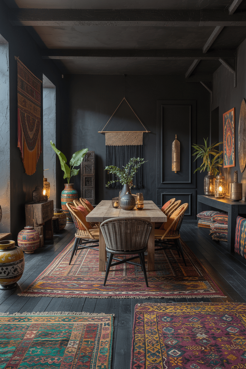 Dark dining room walls and furniture can make a bold statement in a boho dining room. Pair them with natural textures, layered textiles, and colorful accents to soften the look and keep it welcoming.