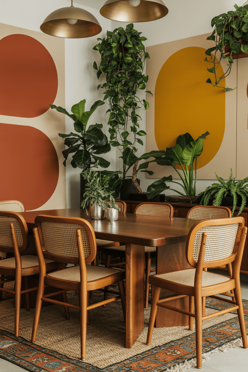 A boho chic dining room blends playful colors, layered textures, and a mix of vintage and modern furniture. This look works beautifully with woven chairs, patterned rugs, and bold wall art. To achieve it, focus on creating a balance between eclectic details and cohesive color palettes, keeping your space lively but harmonious.