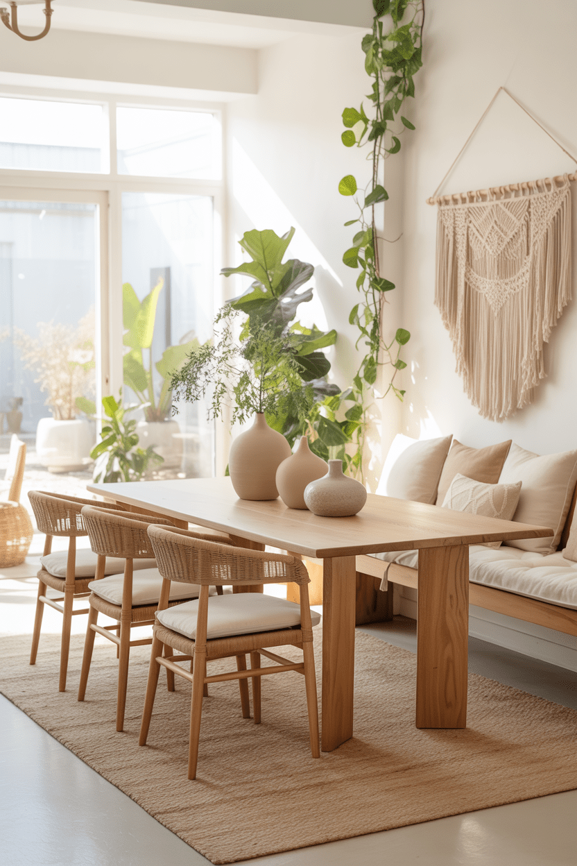 Light colors, natural textures, and minimal design create a Scandinavian boho dining room. Layer rugs, cushions, and greenery to add warmth and the signature boho eclectic touch.