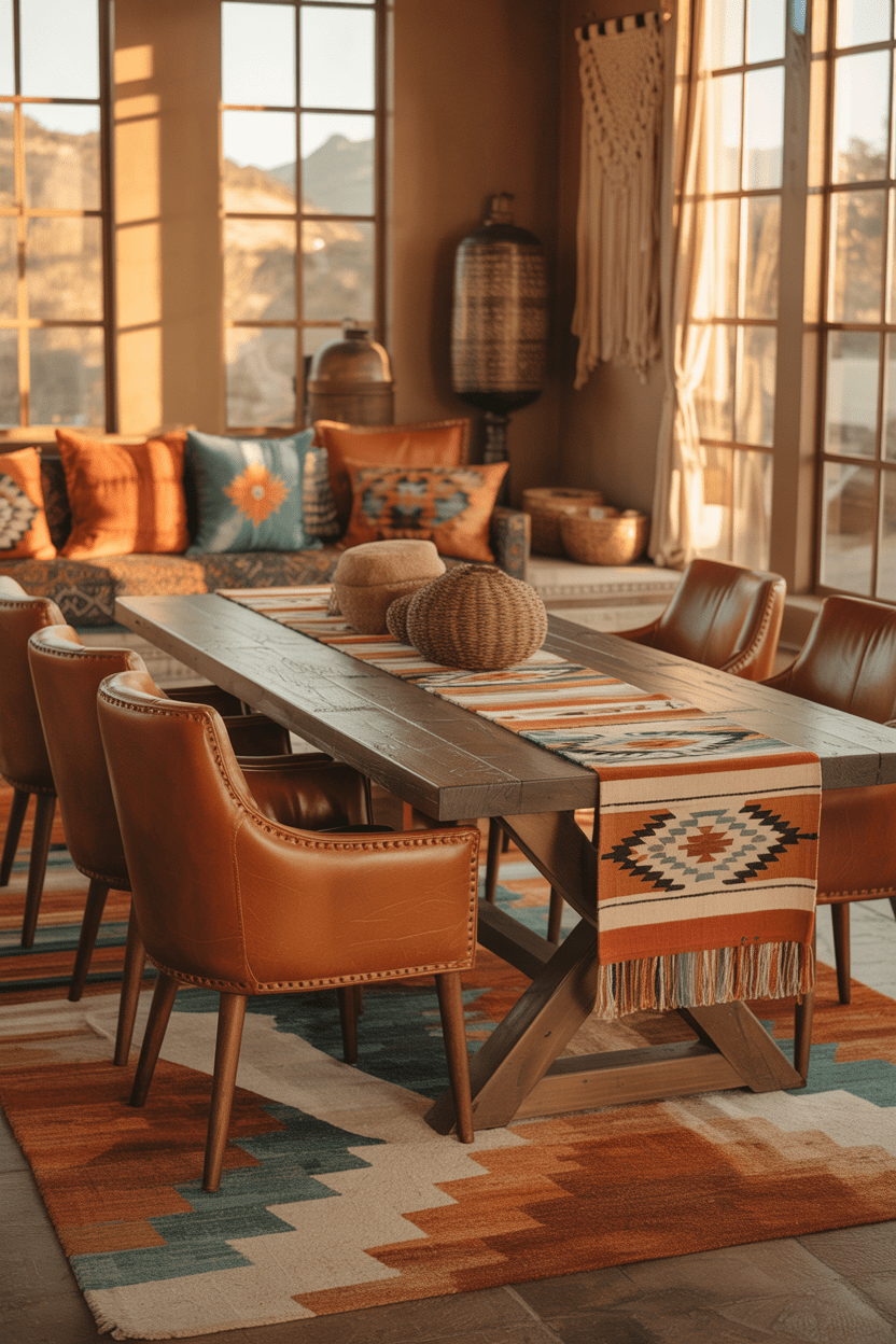Southwestern patterns, earthy tones, and rustic accents give a western boho dining room a relaxed, adventurous vibe. Mix patterned textiles with leather or wood furniture for authenticity.
