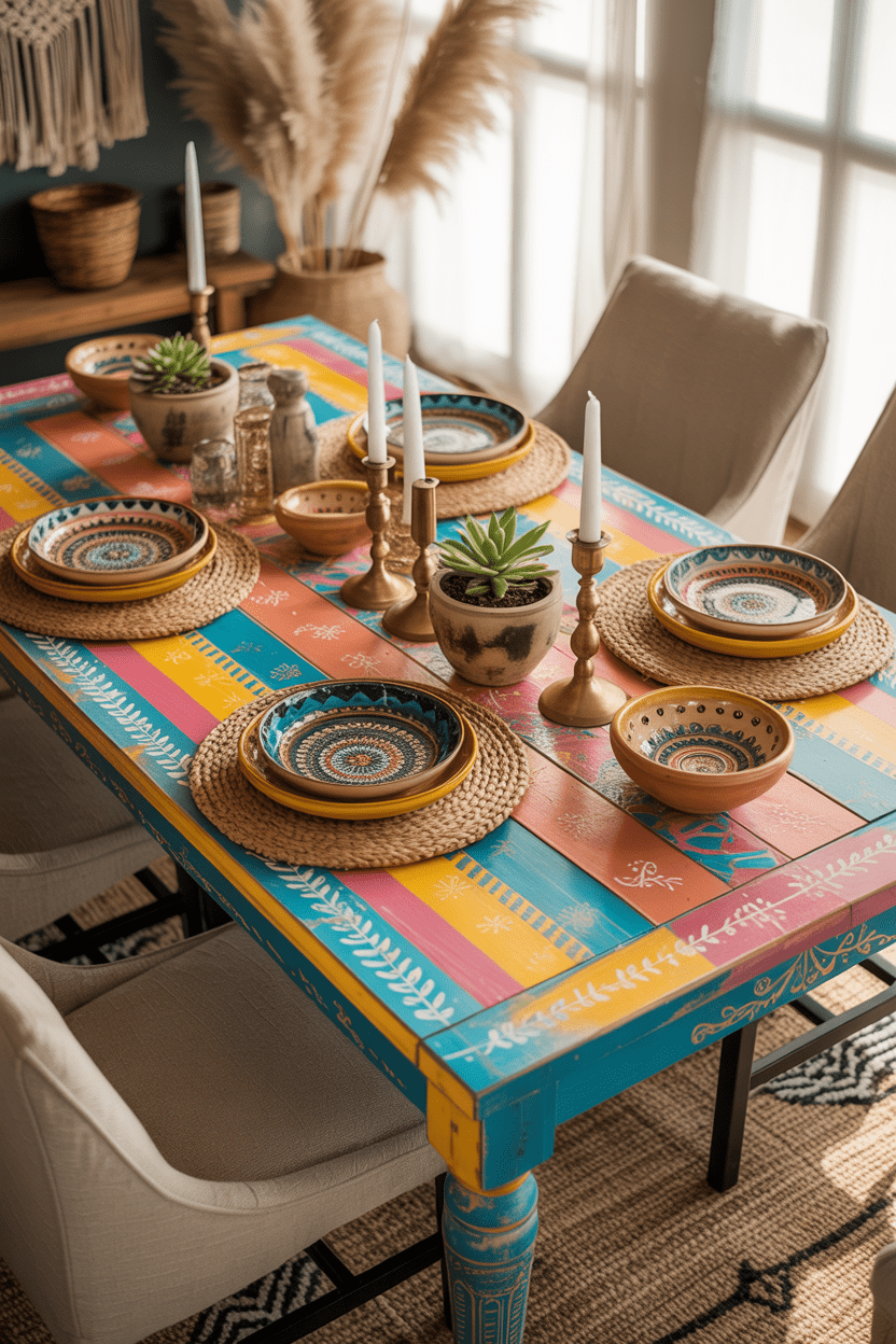 Hand-painted or colorful tables create a unique focal point in a boho dining room. Pair them with neutral furniture and layered textiles to make the table pop without overwhelming the space.