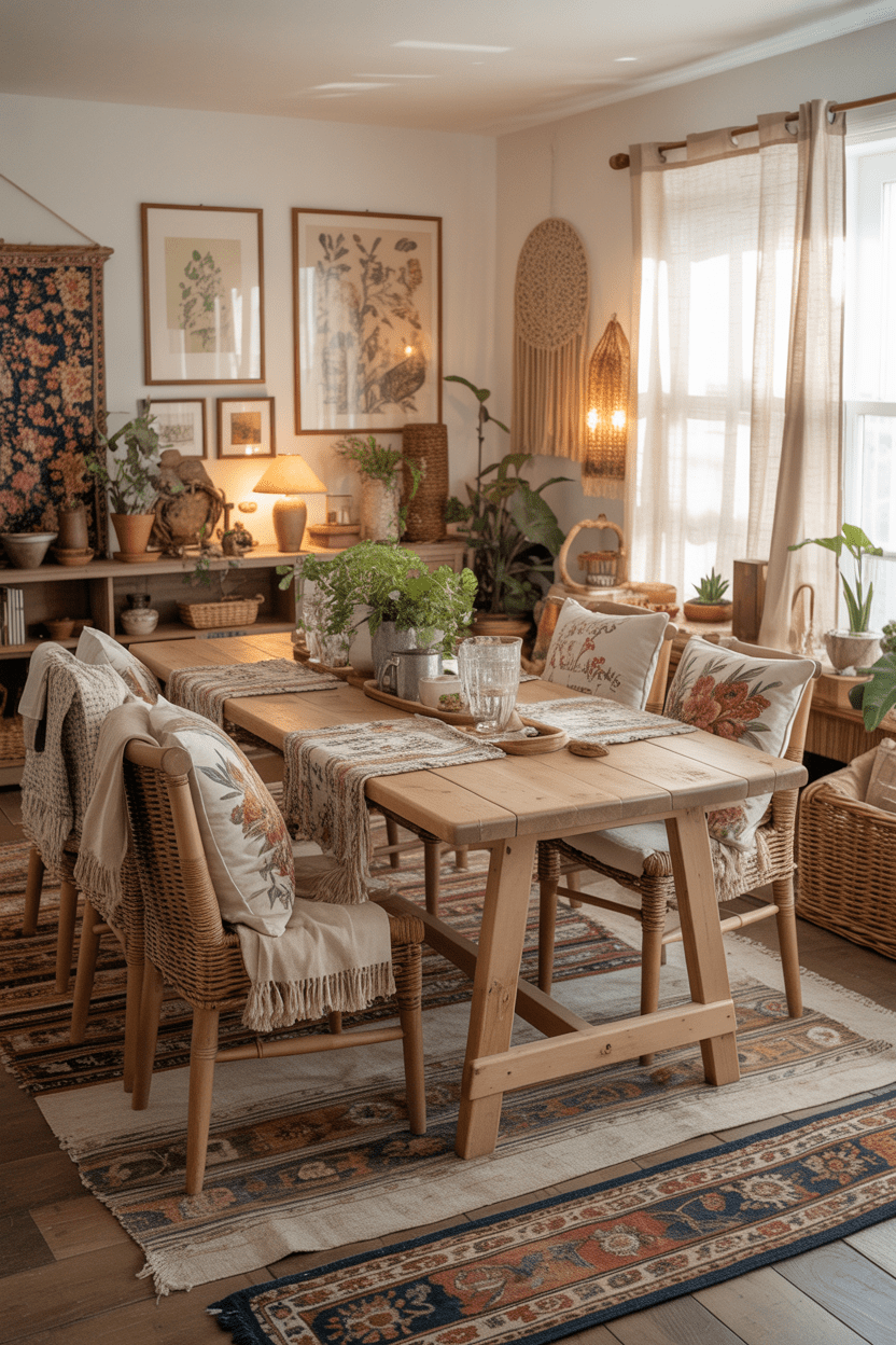Cozy, whimsical touches define a boho cottage dining room. Floral patterns, natural textures, and charming decor details create a warm, inviting atmosphere that’s full of personality.