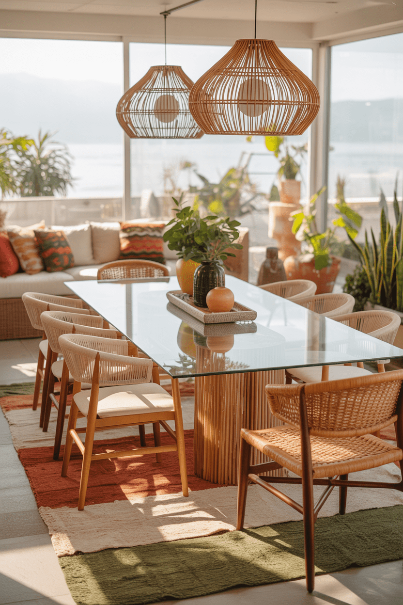 Light, airy colors and natural textures create a breezy coastal boho vibe. Think rattan chairs, linen textiles, soft blues, and jute rugs. This style is perfect for bringing a relaxed, beachy feel into your dining room.