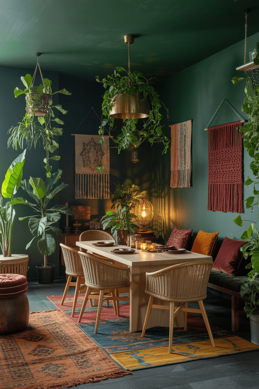 Dark, moody colors paired with rich textures create a dramatic boho dining room. Deep greens, navy blues, or charcoal walls provide the perfect backdrop for vibrant textiles, woven accents, and natural wood furniture, giving your space depth and character.