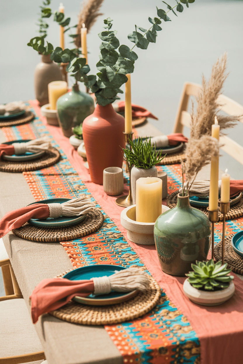 The dining table is the heart of your space, and boho table decor adds personality. Mix candles, ceramic vases, greenery, and patterned runners for a layered look. Rotating seasonal decor keeps the table fresh and aligned with your boho dining room style.
