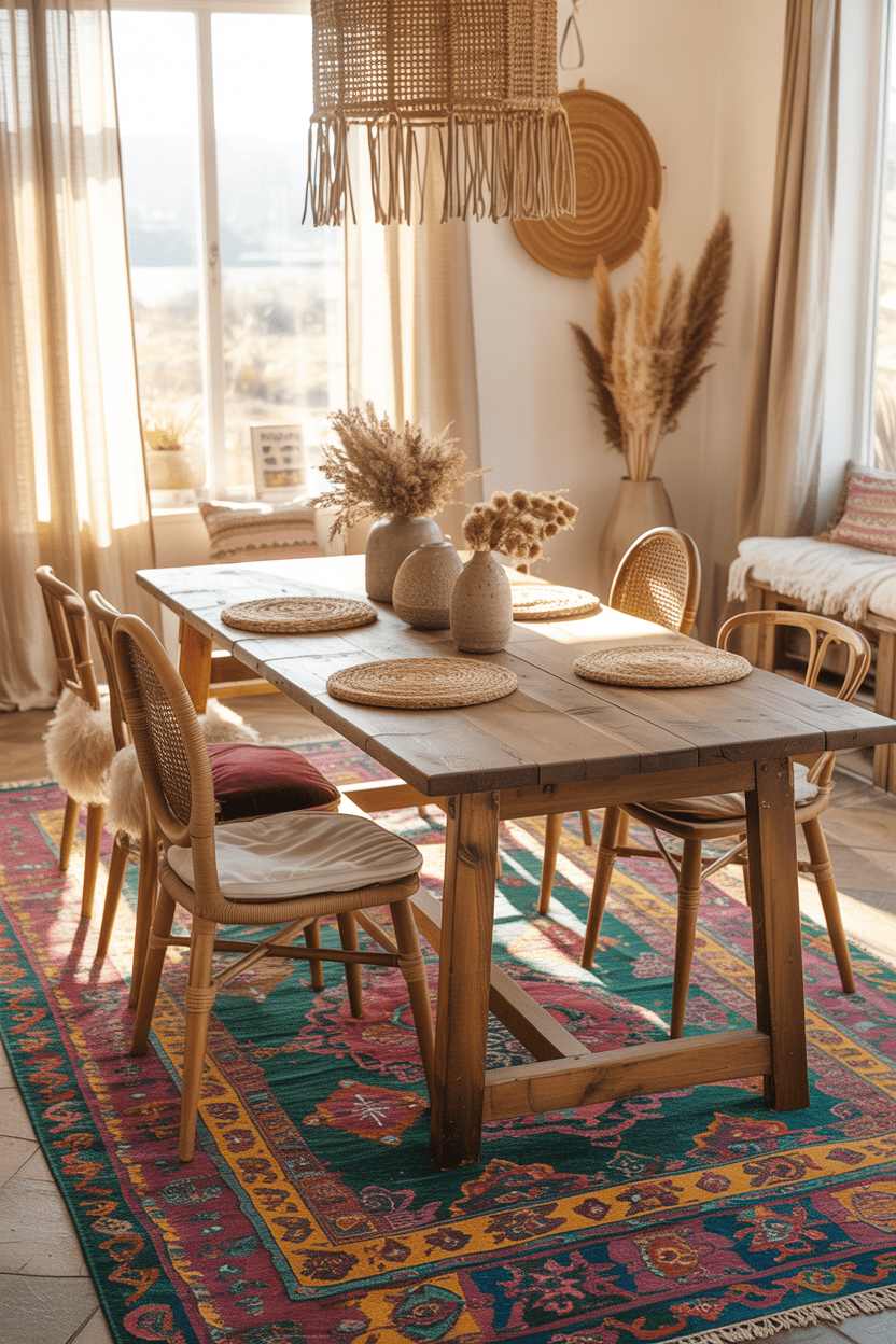 A colorful or patterned rug anchors the dining area and adds warmth and texture. Choose a vintage-inspired or handwoven piece to tie together furniture, lighting, and wall decor in a boho dining room.