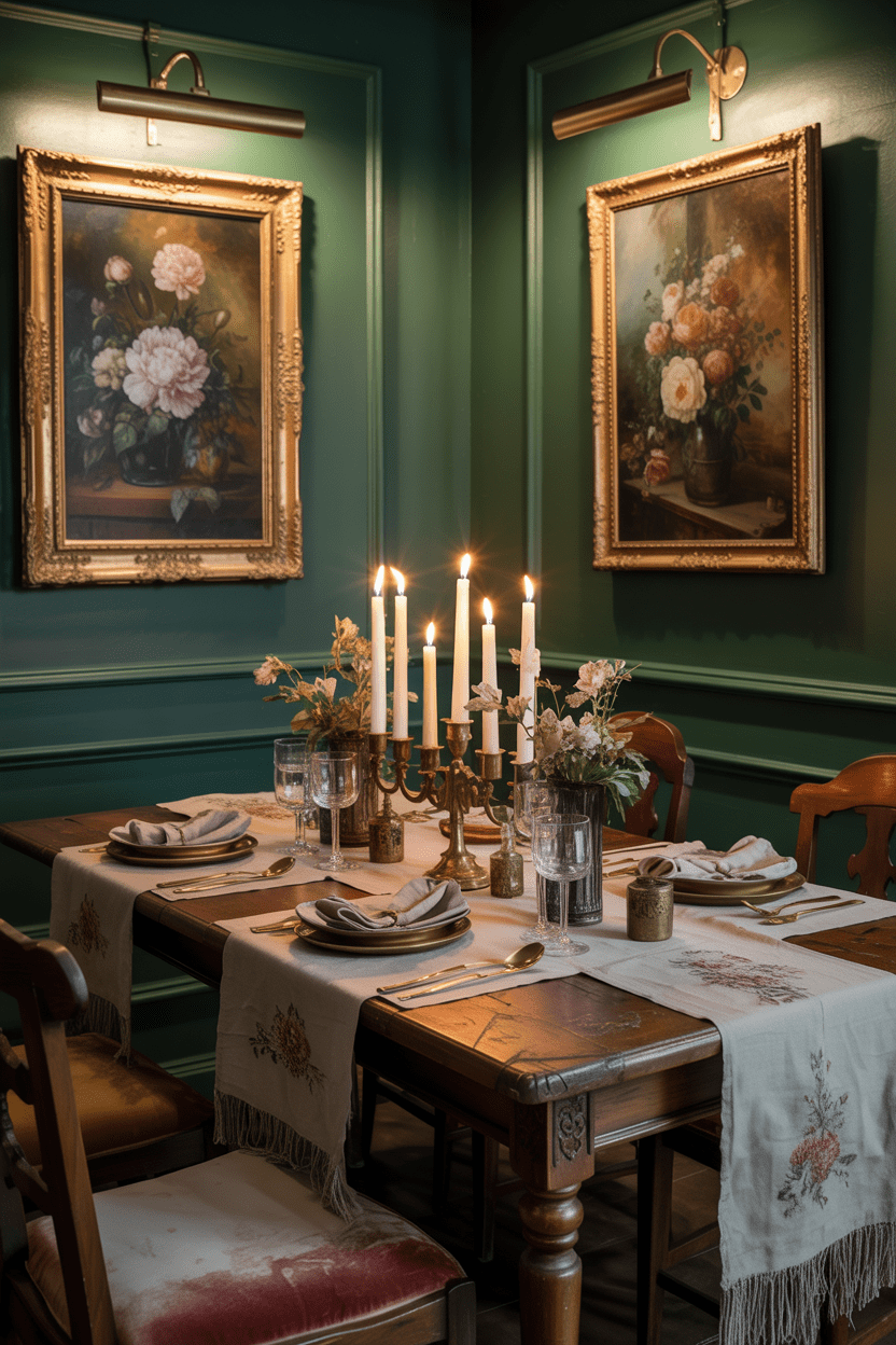 If you want a space that feels dramatic and romantic, a dark cottagecore dining room is such a stunning choice. Deep green, charcoal, or navy walls create the perfect backdrop for warm wood tones and flickering candlelight. I love layering in brass candlesticks, vintage frames, and rich textures to soften the look and make it feel inviting. This cottagecore dining room idea is especially beautiful for evening gatherings, creating a cozy, intimate atmosphere that feels straight out of a storybook.