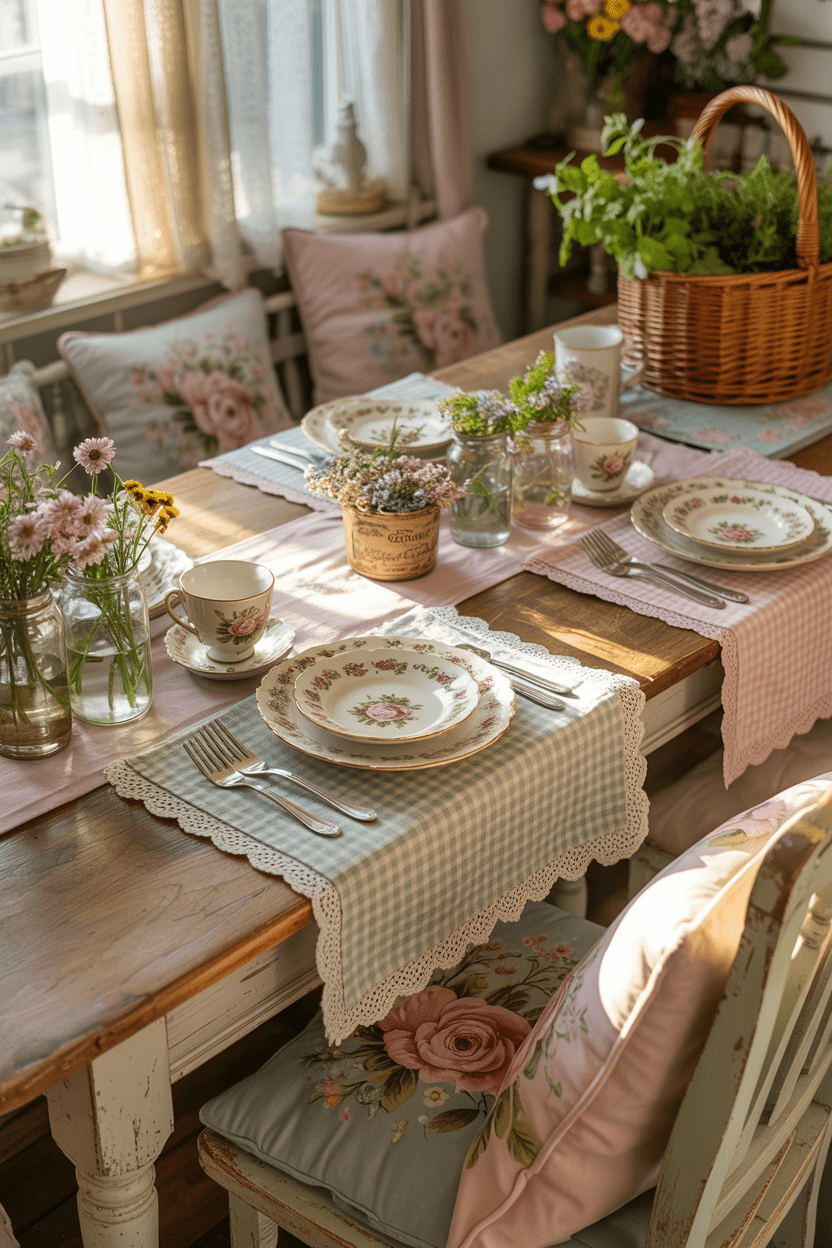 Mixing patterns like florals and gingham instantly brings life into a cottagecore dining room. I like to layer these through table linens, cushions, and even window treatments to create a cozy, inviting feel. The key is to keep the color palette soft so everything still feels cohesive.
