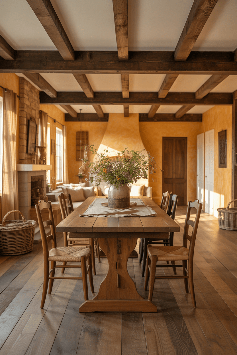 Natural wood elements add so much warmth to a cottagecore dining room. If you have exposed beams, definitely highlight them, but even if you don’t, you can bring in earthy finishes through furniture and decor. These textures help ground the space and enhance that rustic cottagecore vibe.