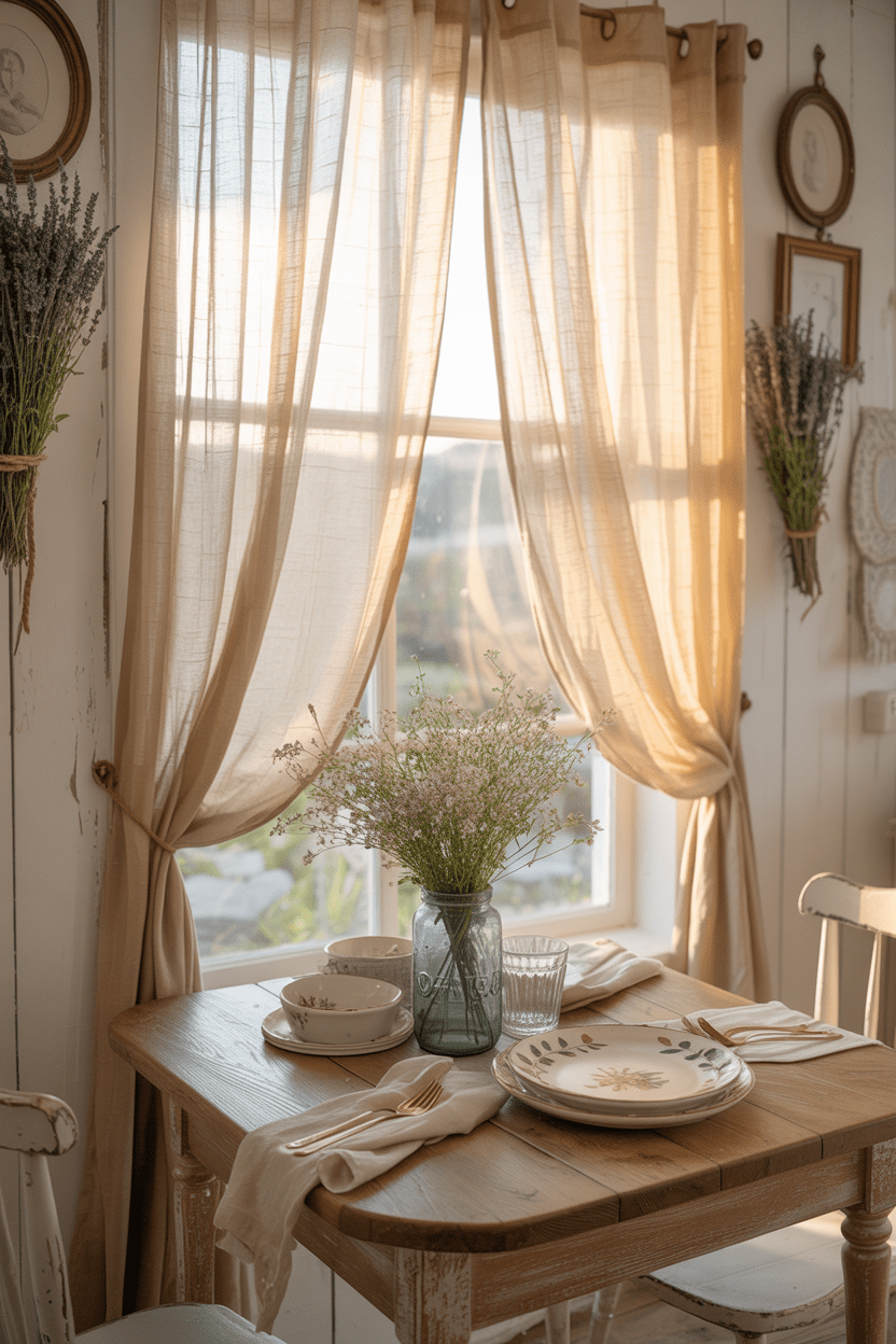 A small dining nook by a window feels so dreamy and perfectly suited to a cottagecore dining room. Adding sheer curtains allows soft light to filter in and creates a romantic atmosphere. I recommend pairing this setup with a small table for a cozy, intimate dining experience.