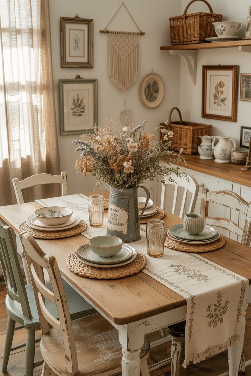 Cottagecore dining rooms truly shine when they include handmade or thrifted pieces. I always look for ceramics, woven baskets, and vintage finds that feel unique and personal. These elements give your space character and make it feel thoughtfully curated over time.