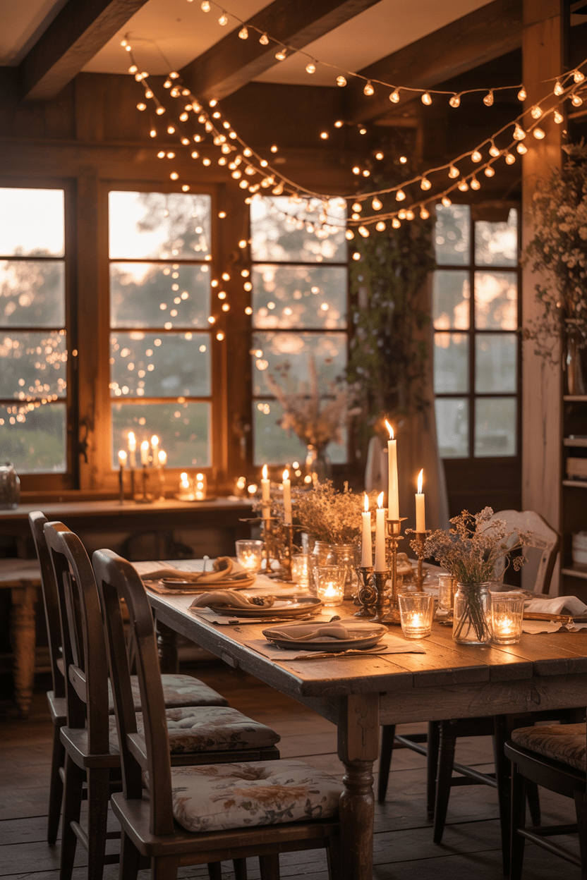 String lights paired with candlelight create a soft, magical glow that instantly elevates a cottagecore dining room. Drape lights along beams or windows and layering in candles for that cozy evening ambiance. It’s perfect for creating a warm, inviting space that feels special every night.