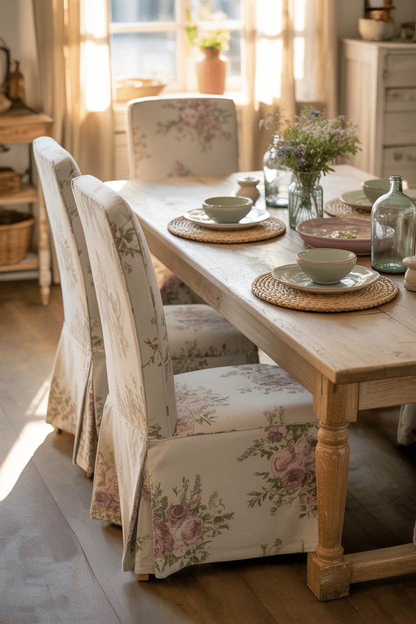 Slipcovered chairs in soft floral fabrics add a relaxed elegance to a cottagecore dining room. I love how they soften the overall look and make the space feel more comfortable and lived-in. Choose muted florals for a timeless, vintage-inspired feel.