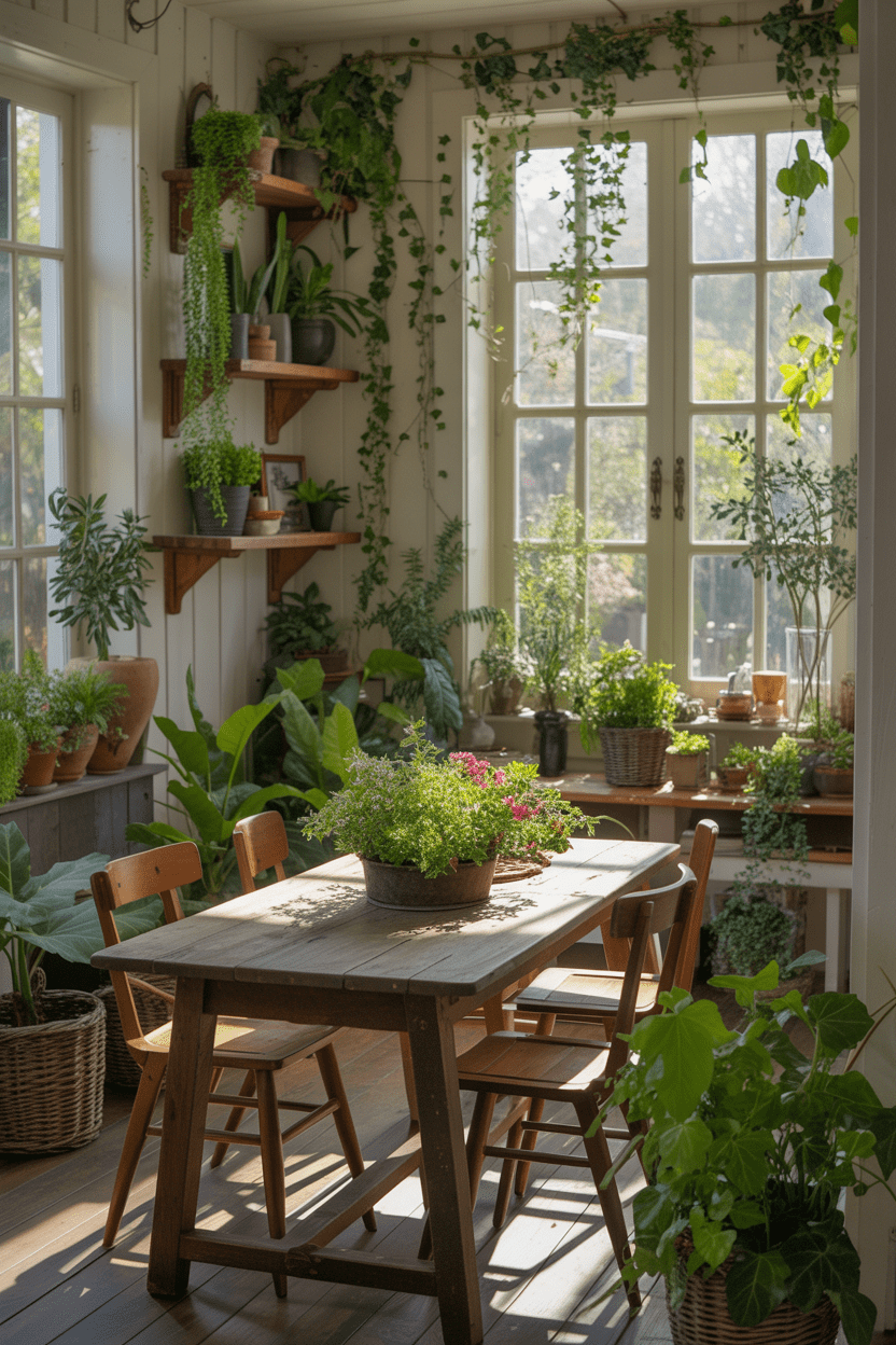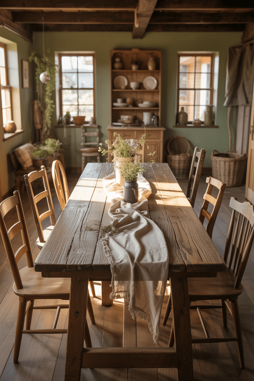 Bringing in lots of greenery is a beautiful way to enhance a cottagecore dining room. I like to scatter potted herbs, trailing plants, and small flowers throughout the space to create that indoor garden feel. It makes the room feel fresh, vibrant, and full of life.