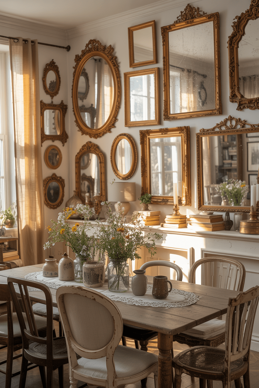 A collection of vintage mirrors adds depth and light to a cottagecore dining room. Use ornate, gilded frames to create an old-world feel that’s both elegant and charming. It’s a great way to make the space feel larger while adding visual interest.