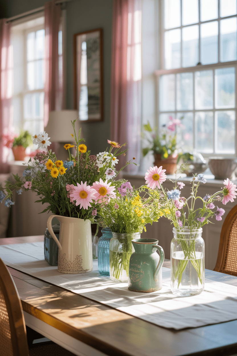 Nothing captures the cottagecore dining room aesthetic quite like a table overflowing with wildflowers. This look feels effortless and organic, like you just gathered blooms from your garden. I like to mix mason jars, vintage pitchers, and glass vases in different heights to keep things visually interesting. Loose, slightly undone arrangements make the whole space feel relaxed and naturally beautiful.