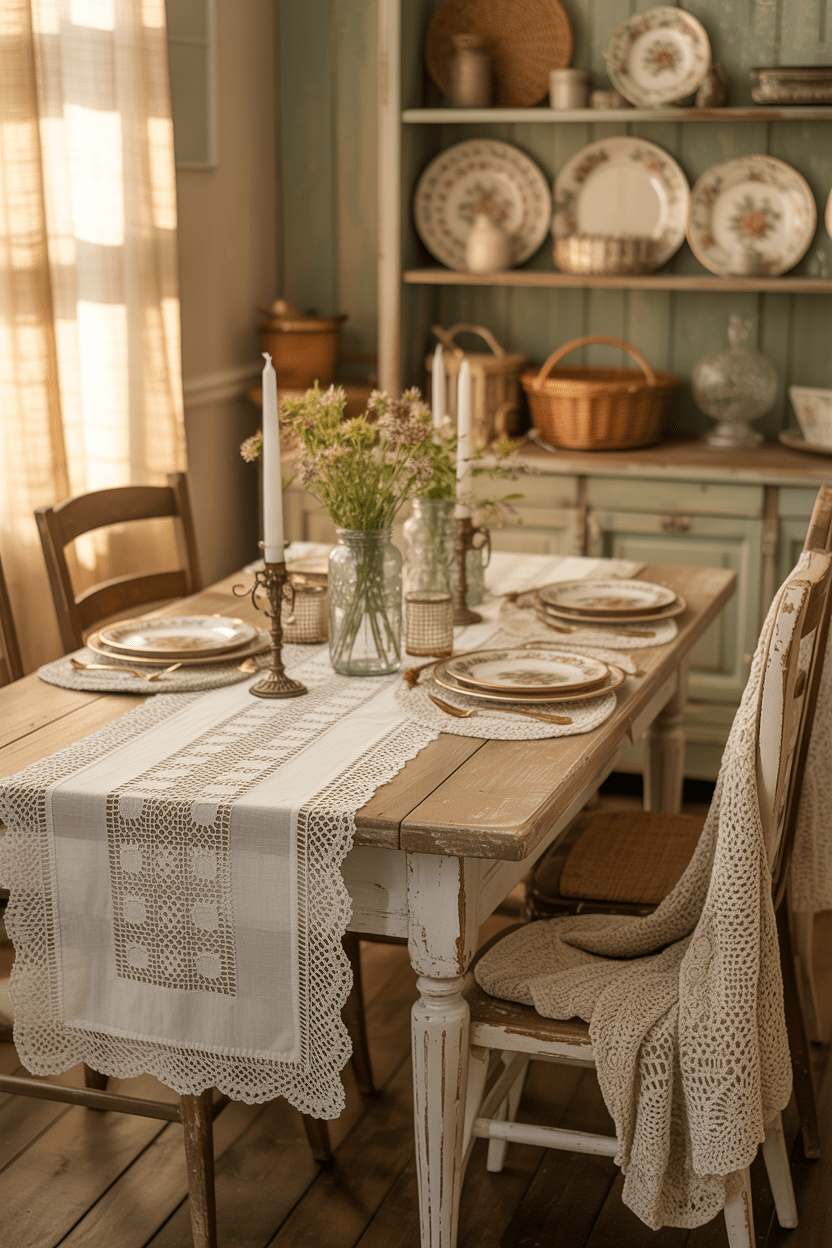 Lace and crochet details add that nostalgic finishing touch to a cottagecore dining room. I like incorporating them through table runners, doilies, or even small decorative accents. These textures bring in warmth and a sense of history that makes the space feel extra special.