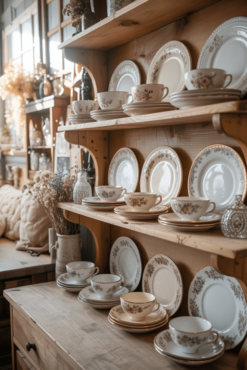 Open shelving filled with delicate floral china is one of my favorite cottagecore dining room ideas. It adds instant charm, color, and personality to your space. I always recommend mixing and matching different sets rather than keeping everything uniform. The more collected and layered it feels, the more authentic your cottagecore dining room aesthetic will be.