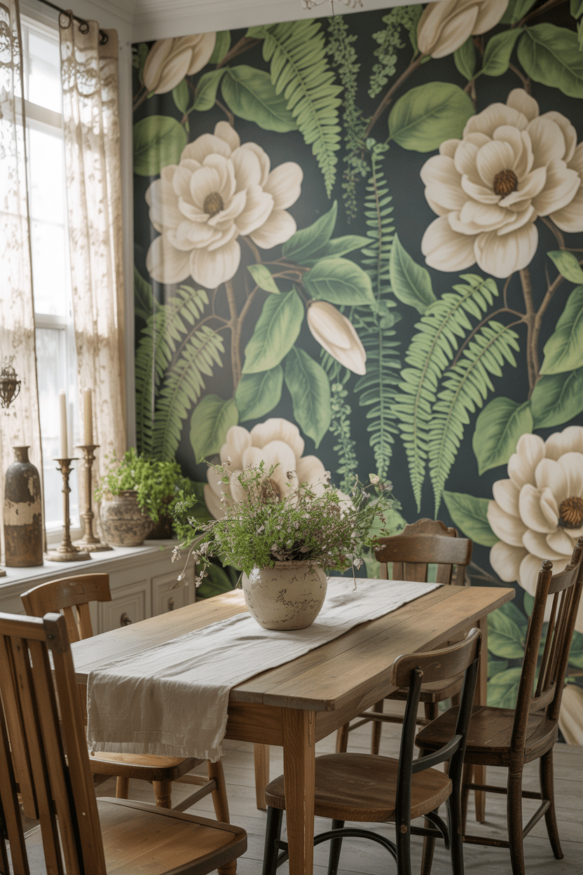 6. Botanical wallpaper for a cottagecore dining room accent wall