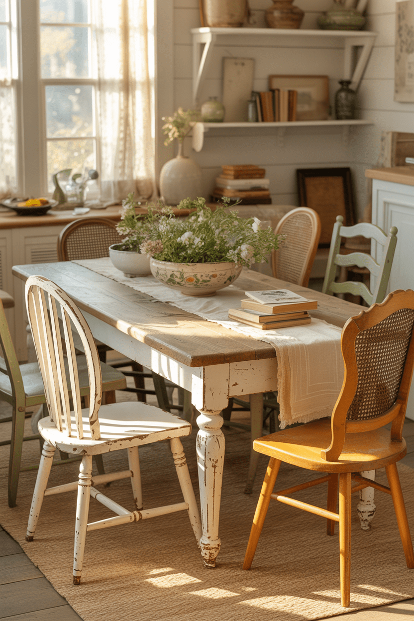 7. Mismatched vintage chairs for eclectic cottagecore charm