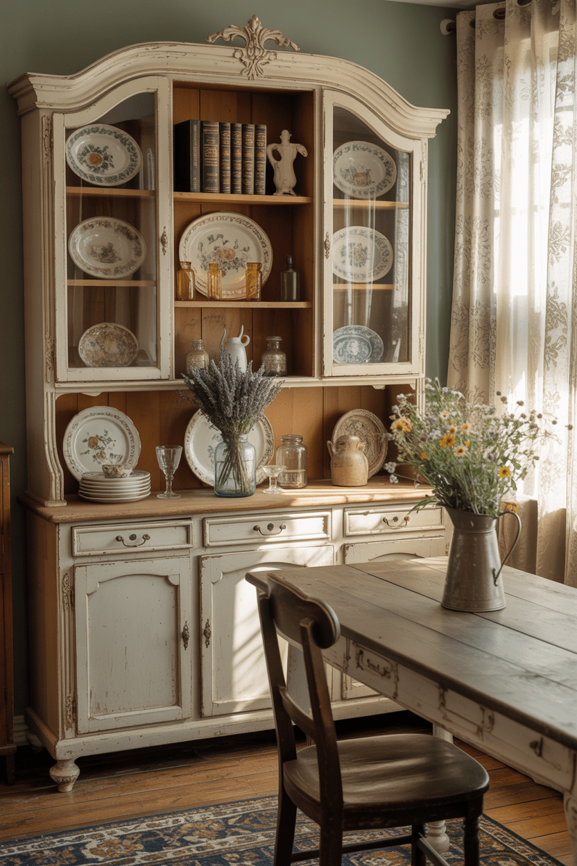 An antique hutch makes the perfect focal point in a cottagecore dining room. It gives you space to display dishes, glassware, and meaningful decor while adding vintage charm. I like to style mine with a mix of practical pieces and decorative accents so it feels curated but still functional.