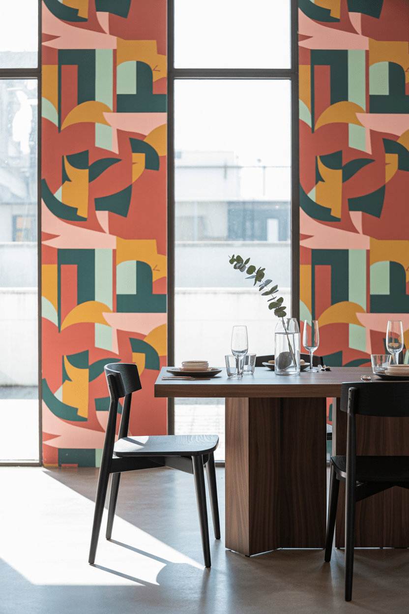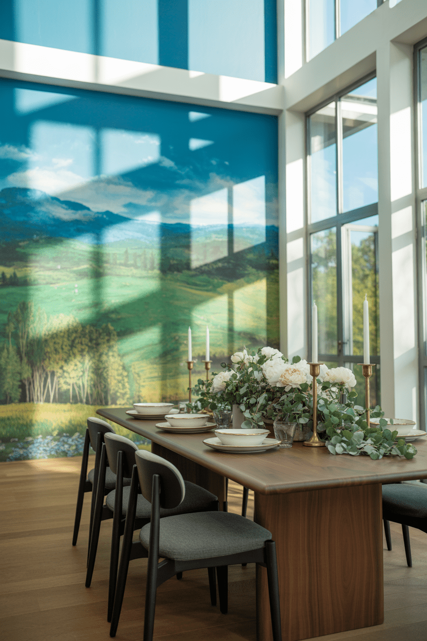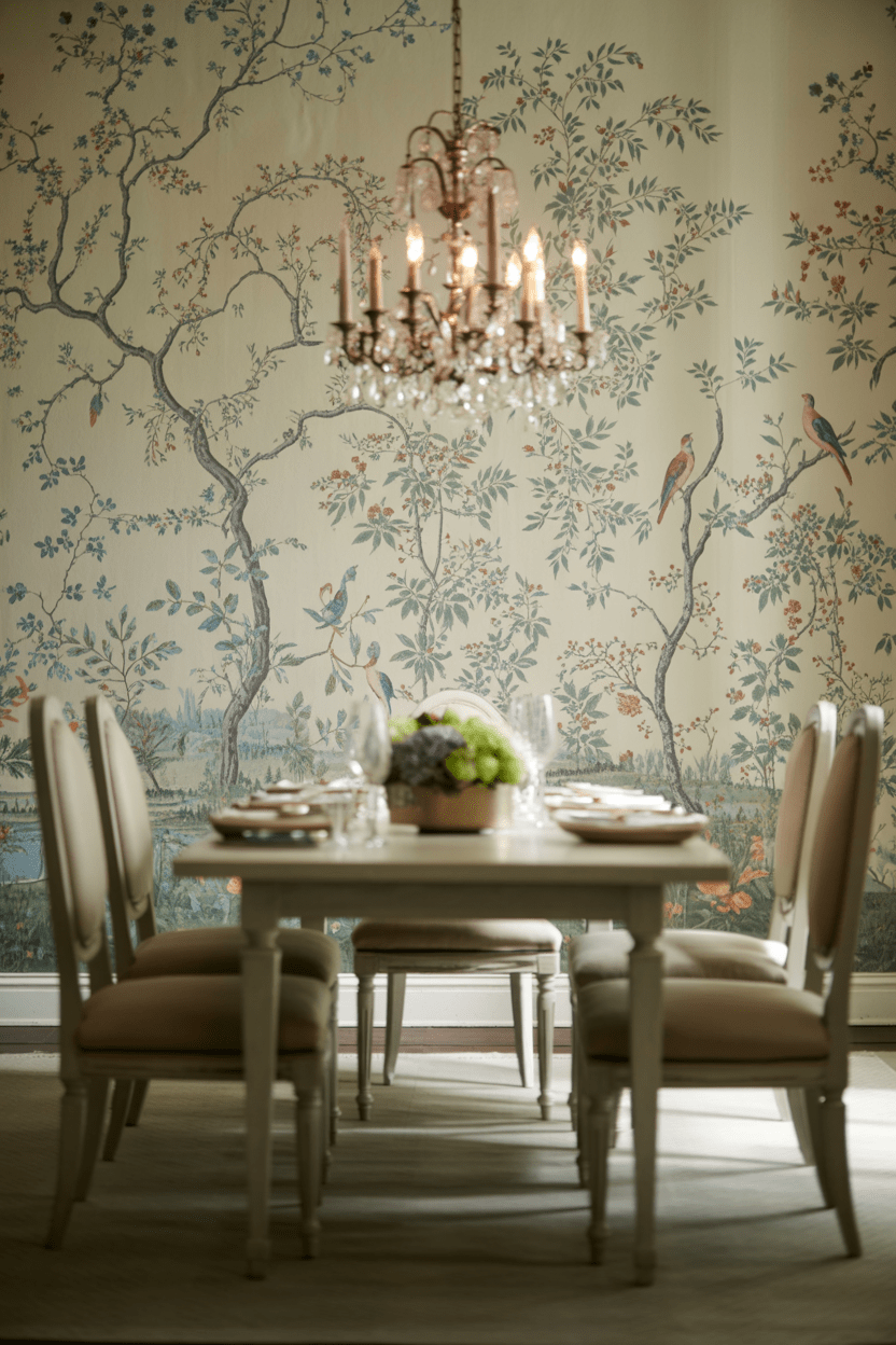 If I want instant drama—like real, stop-you-in-your-tracks drama—I reach for mural wallpaper. Scenic landscapes, painterly florals, or chinoiserie-style murals completely transform a dining room. A mural wallpaper dining room looks best when you keep the furniture simple and let the walls carry the moment.