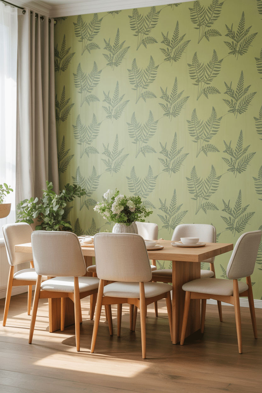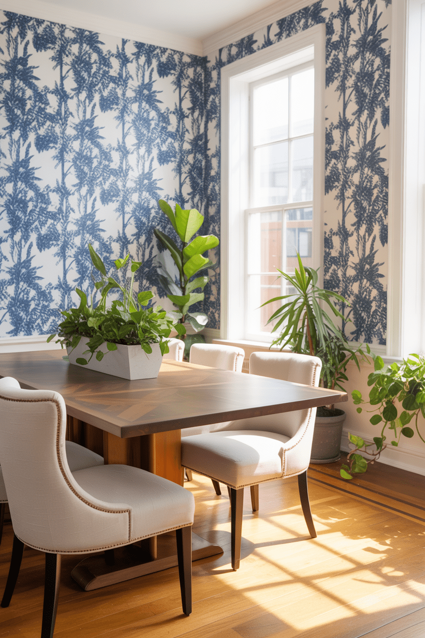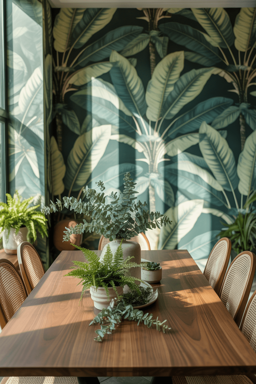 Botanical wallpaper dining room styles feel refreshing and grounded. Soft leaves, oversized branches, or even forest-inspired prints bring the outdoors in and make the dining room feel alive.
