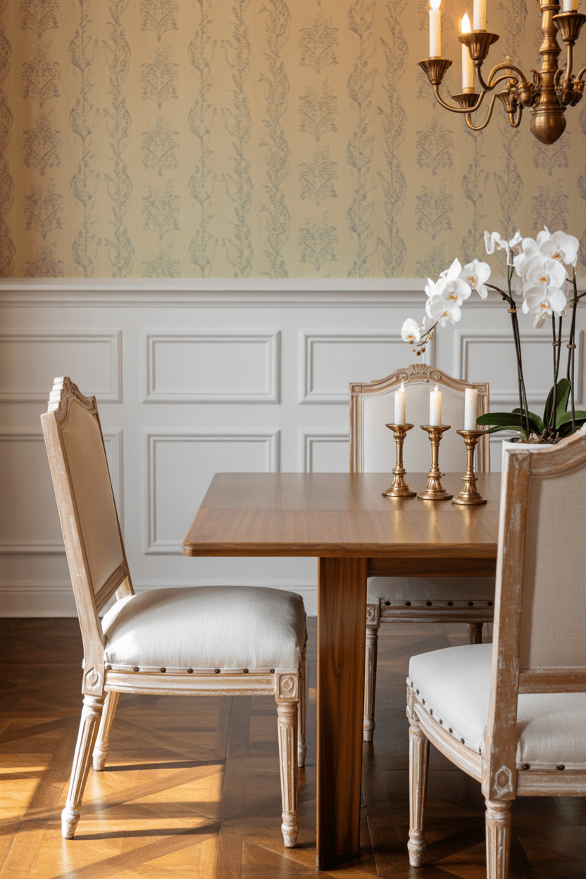 - Mix wallpaper with wainscoting or chair rail to add structure and visual balance.