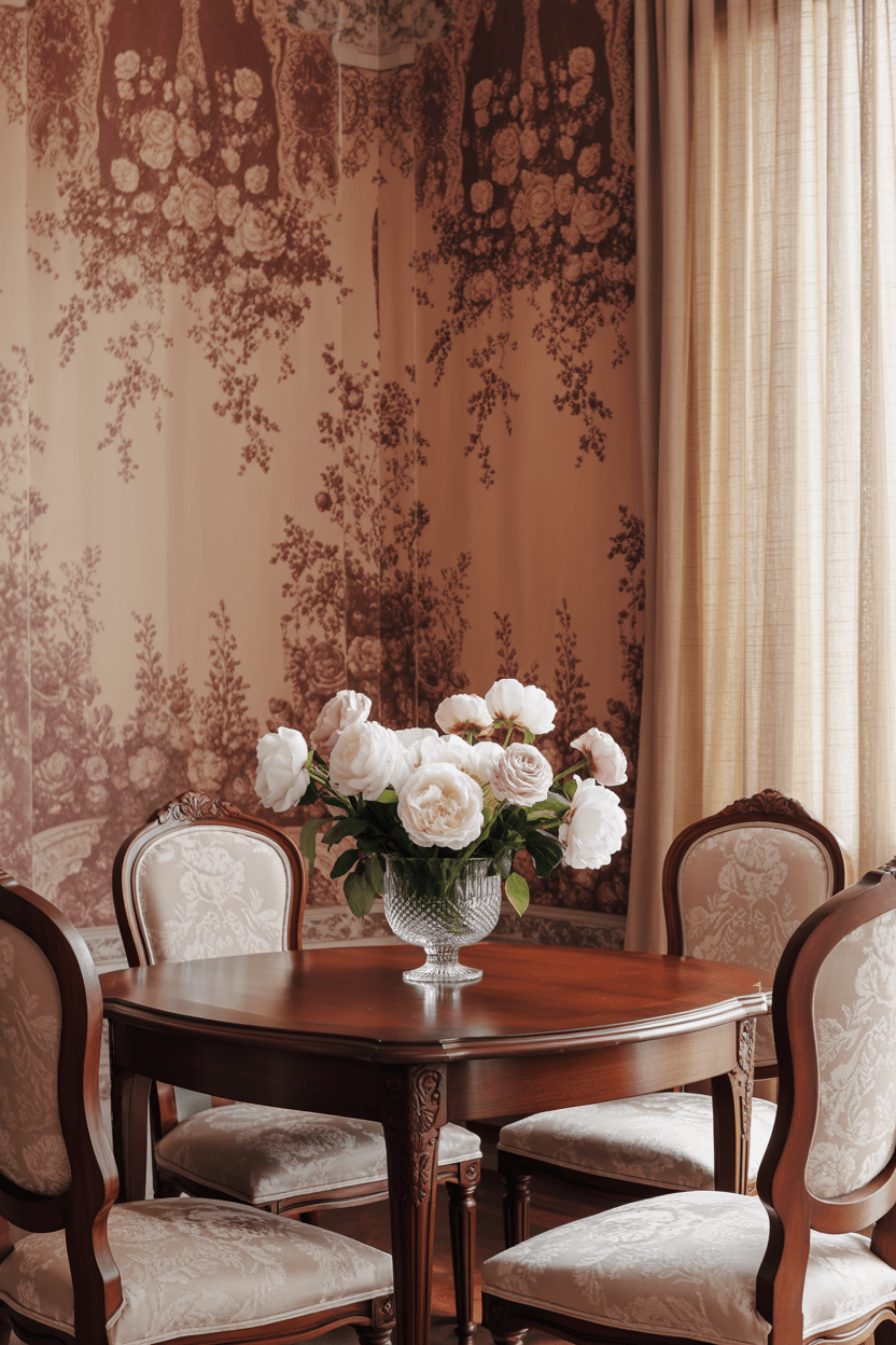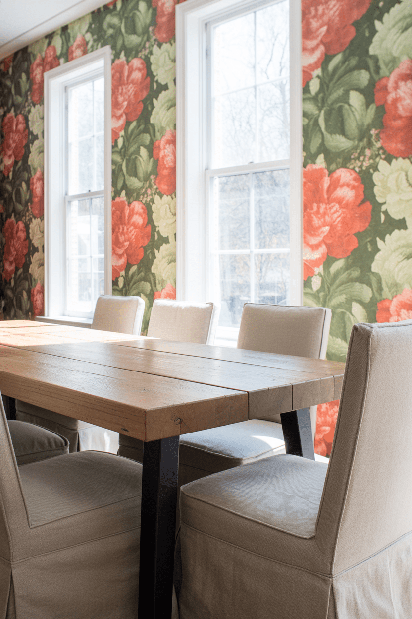 I’ll never stop loving vintage floral dining room wallpaper. The faded edges, the soft colors, the old-world charm—it all feels like a warm hug. Pair it with antique frames or vintage china for a cohesive look.