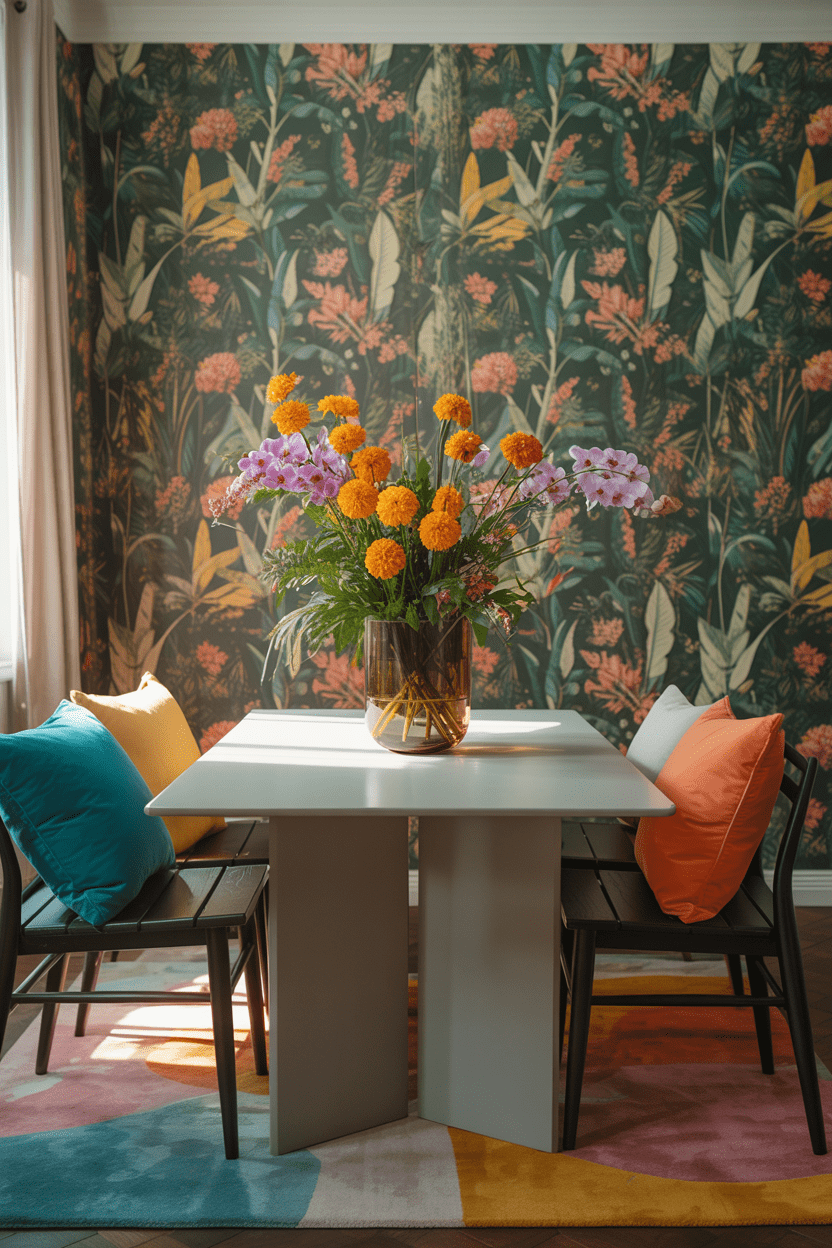 Ready to have fun? Funky wallpaper dining room designs—like zebra prints, vibrant botanicals, or bold geometrics—instantly turn the space into a conversation starter. Keep the furniture simple to let the wallpaper shine.