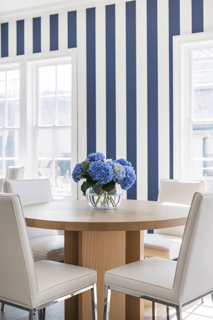Striped wallpaper dining room looks are always fresh. Vertical stripes elongate the room, while horizontal stripes widen it. Blue-and-white stripes give off the prettiest coastal vibe.