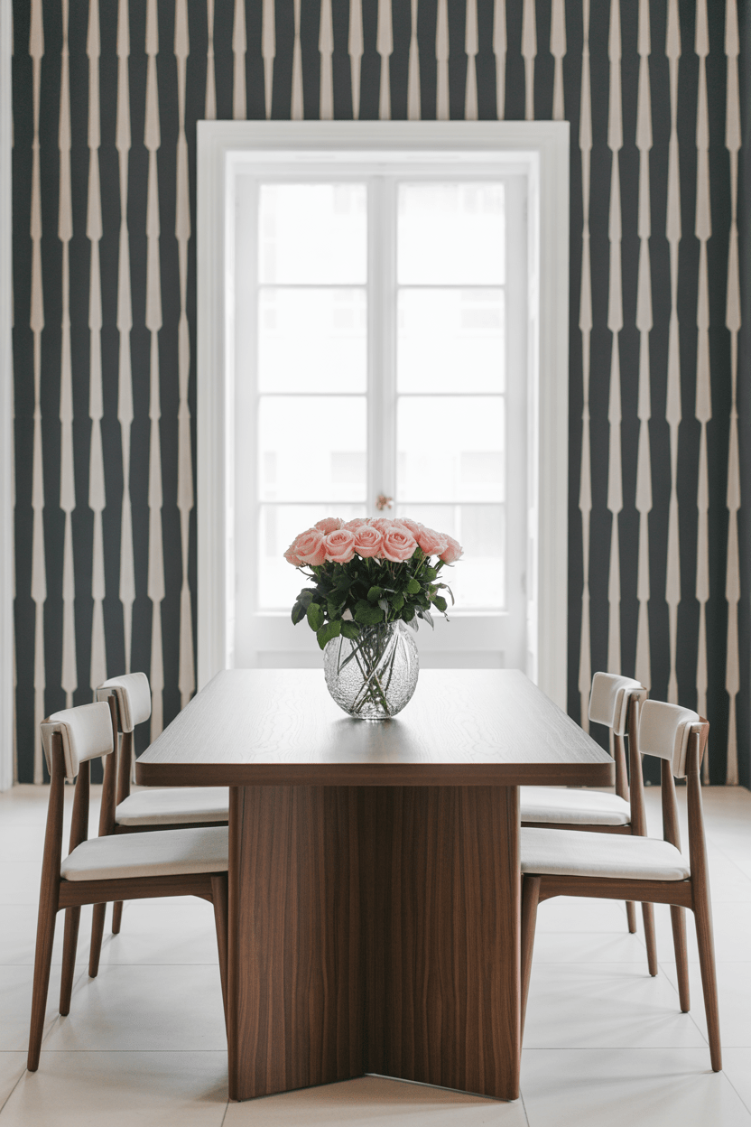 Modern wallpaper dining room looks are all about clean lines, abstract shapes, and soft neutrals. If your home leans contemporary, this option keeps your dining space looking streamlined and intentionally designed.