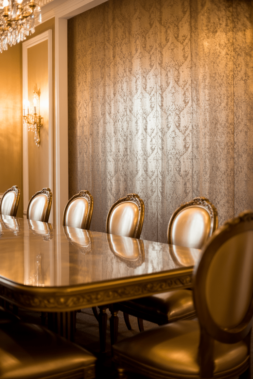Gold wallpaper dining room styles are perfect when you want a hint of glamour. Metallic grasscloth, gold geometrics, or subtle shimmer patterns catch the light beautifully during evening dinners.