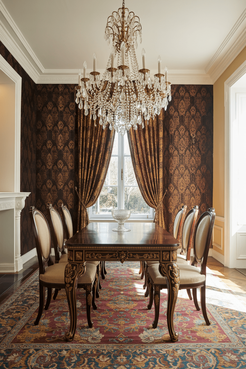 Traditional dining room wallpaper with damasks or scrollwork brings so much elegance. It’s perfect if you want a classic, formal look that feels intentionally curated.