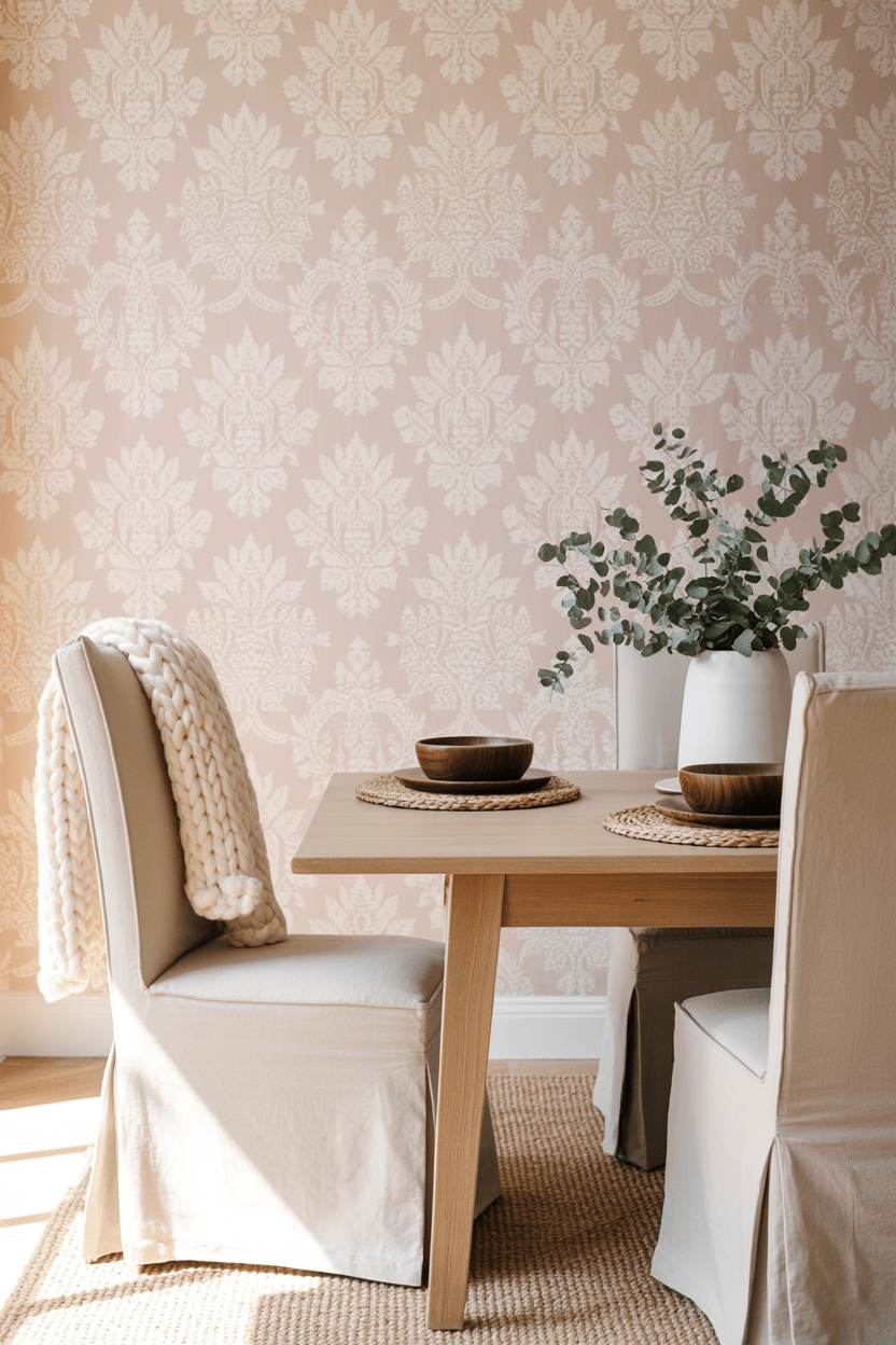 If your space leans cold or open, warm-toned wallpaper helps make the dining room feel intimate. This is especially lovely in small dining rooms or open-concept homes.
