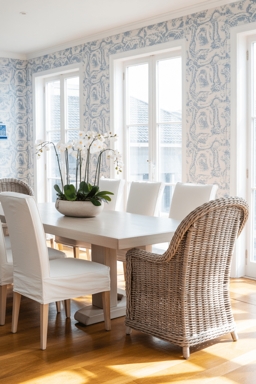 Blue-and-white wallpaper dining room designs always feel happy and effortless. Think crisp stripes, soft florals, and breezy grasscloths. Add woven textures, and you’ve got an instant coastal oasis.