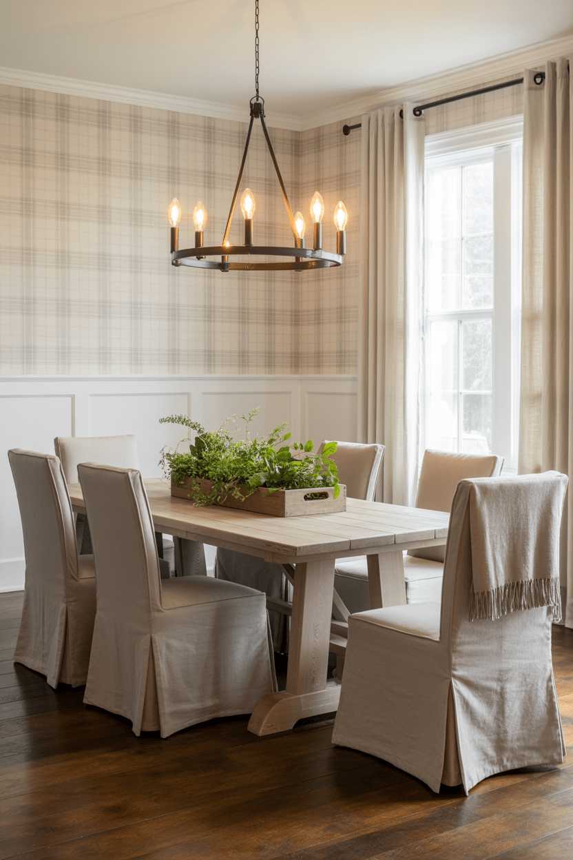 Modern farmhouse wallpaper dining room ideas—like plaid, shiplap pairings, or muted botanicals—strike the perfect balance of rustic and refined. It’s cozy, classic, and incredibly welcoming.