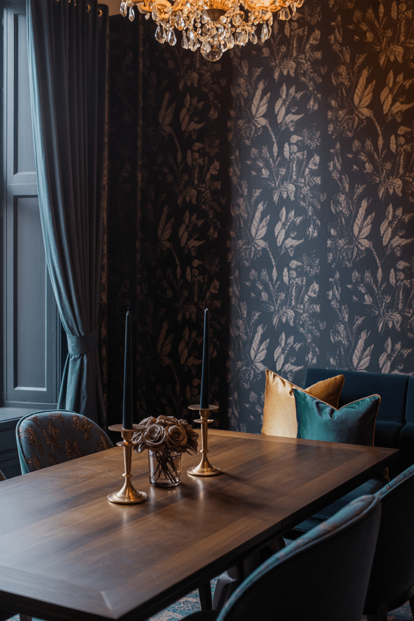 - For moody wallpaper dining room designs, warm lighting makes all the difference.